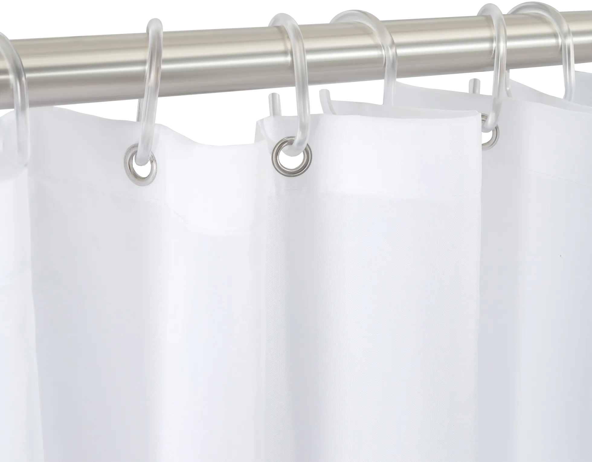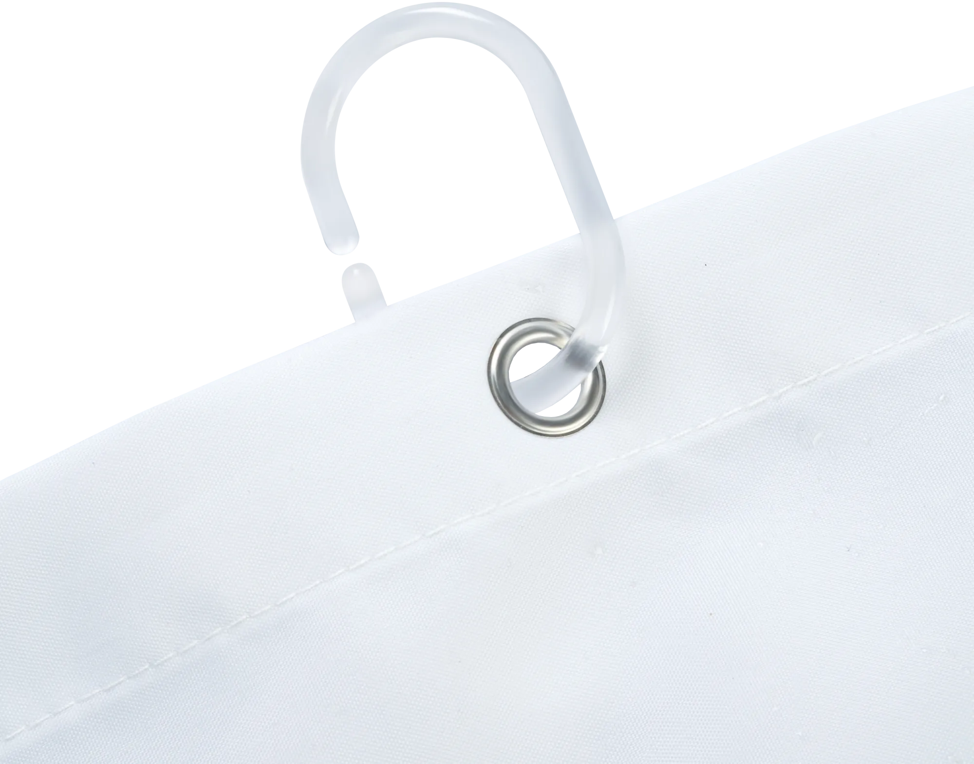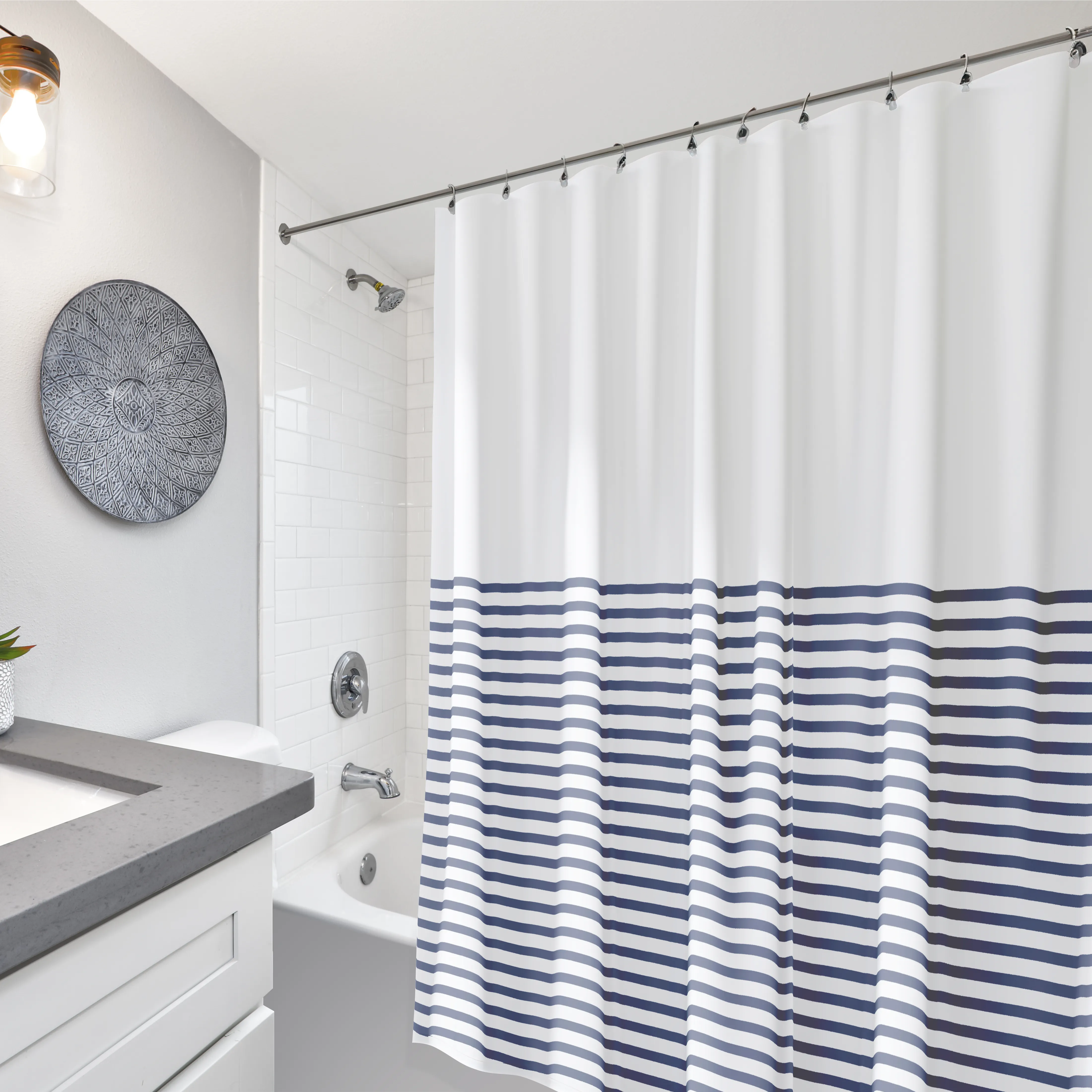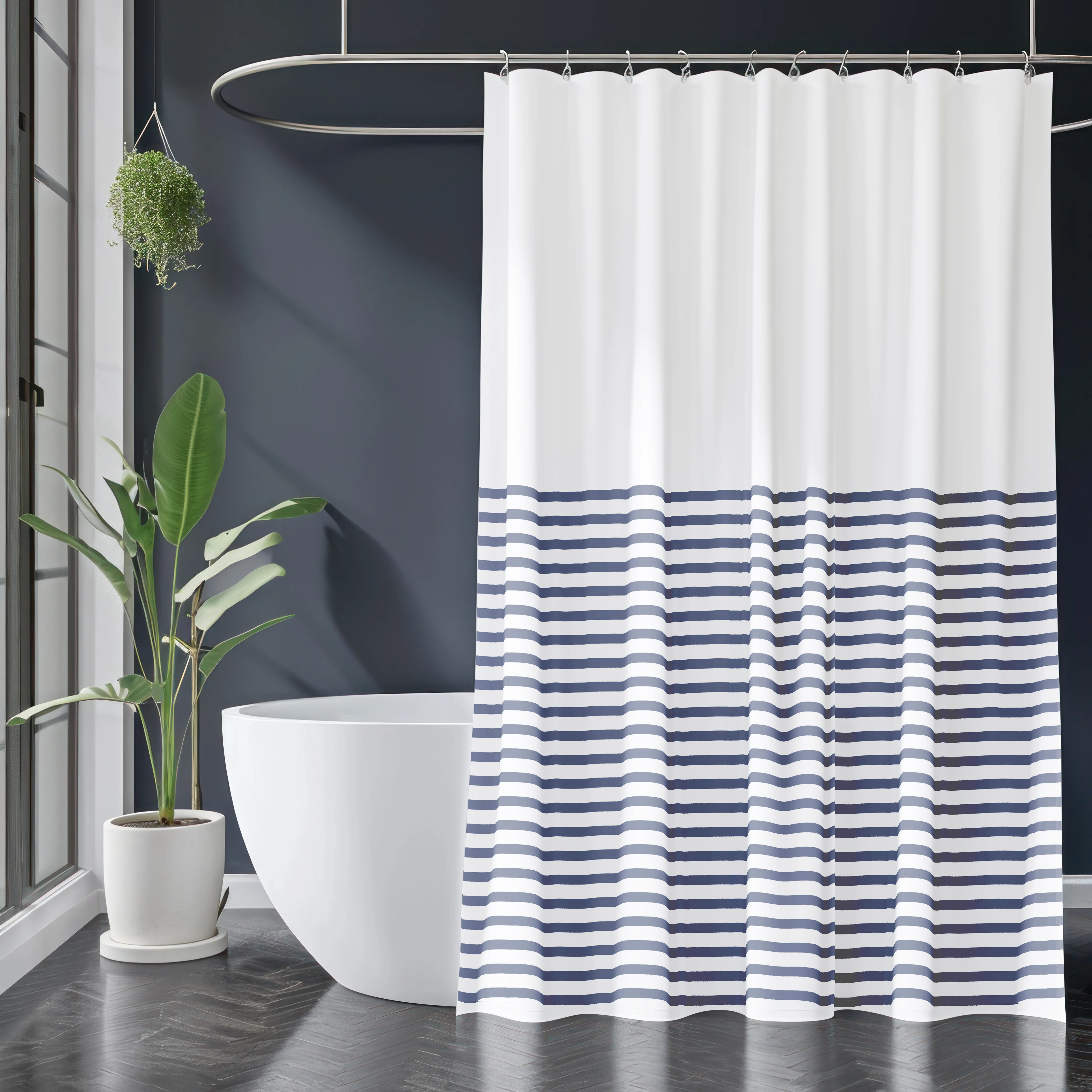 Геометрический рисунок тканевой шторки станет главным акцентом в ванной комнате. Прозрачные кольца-крючки в комплекте.
