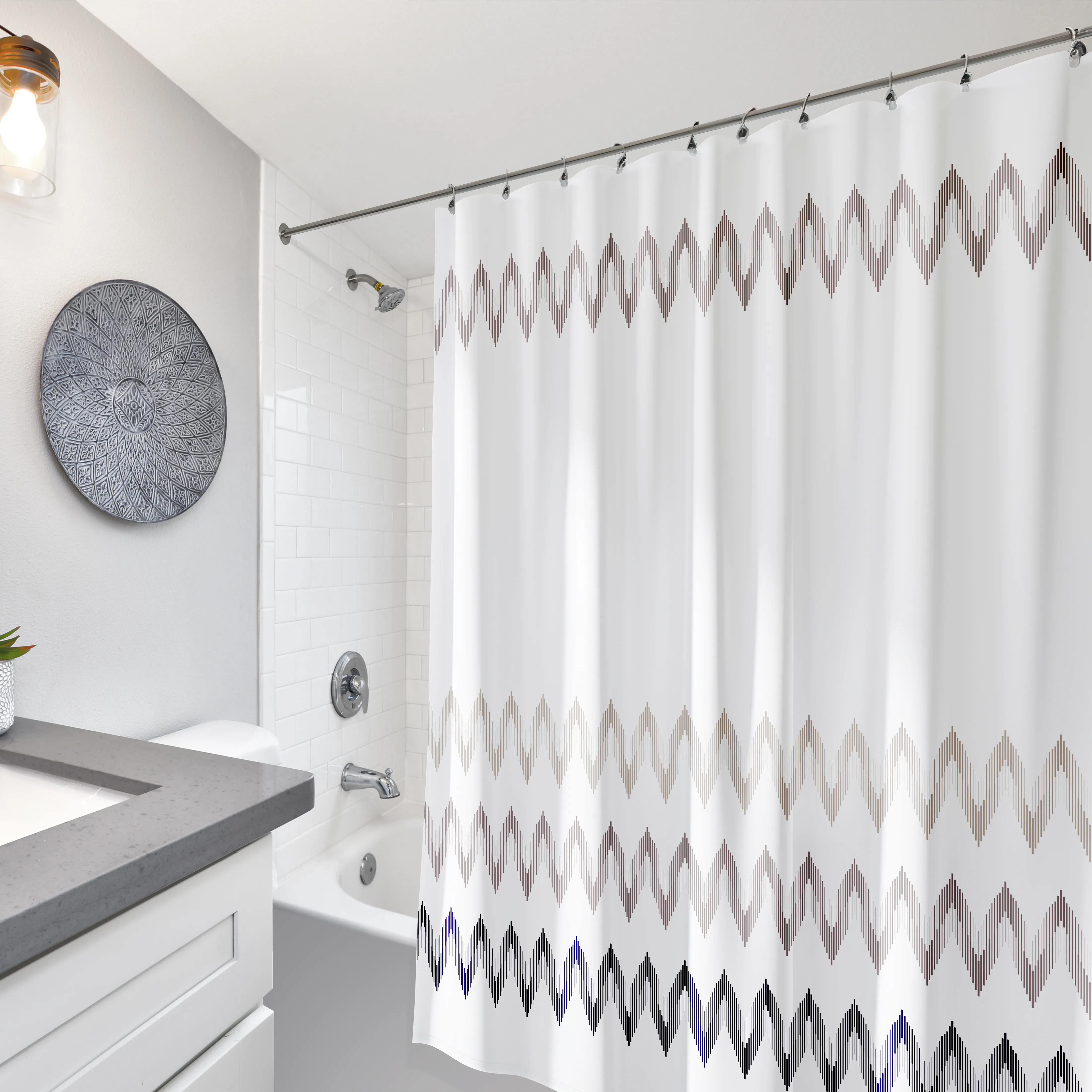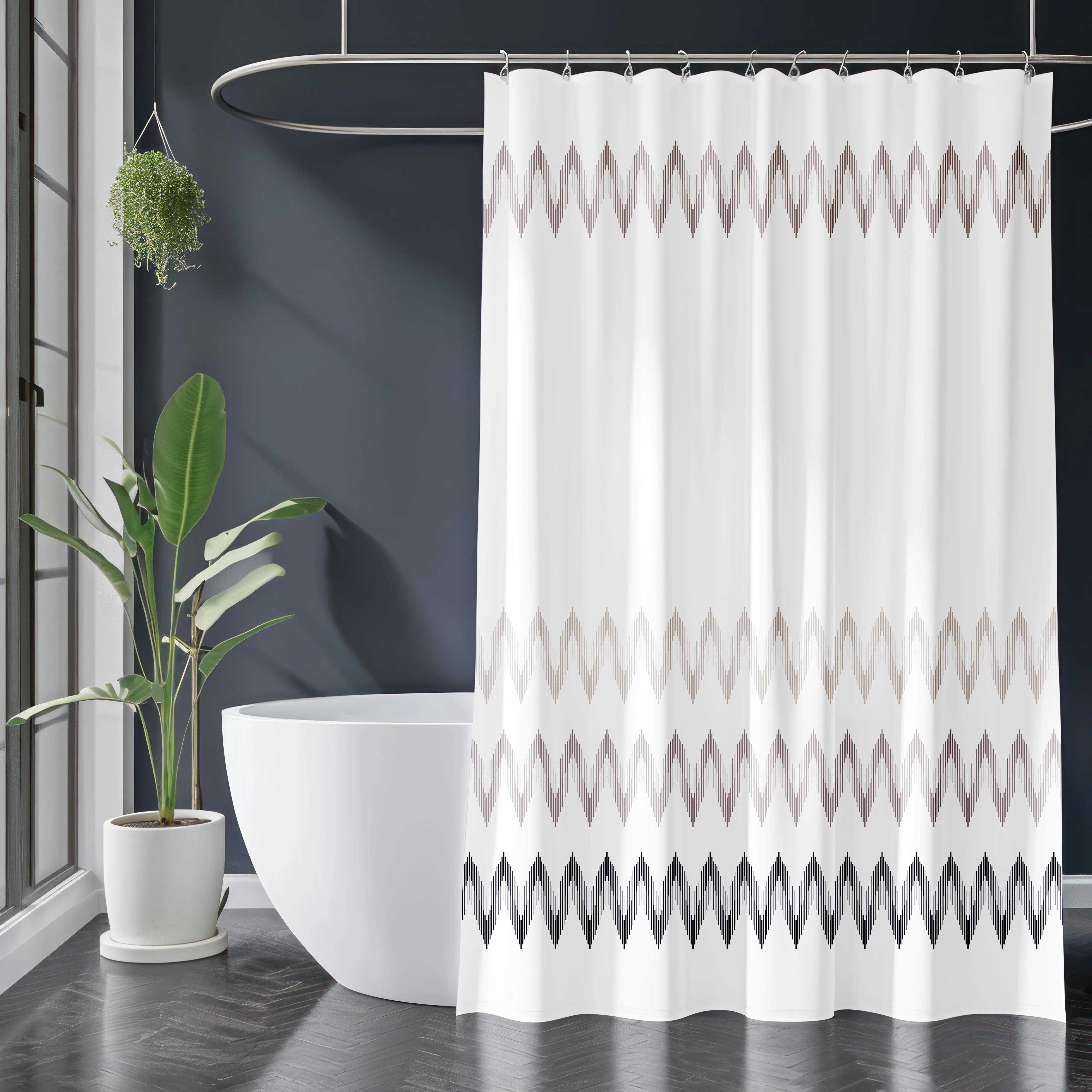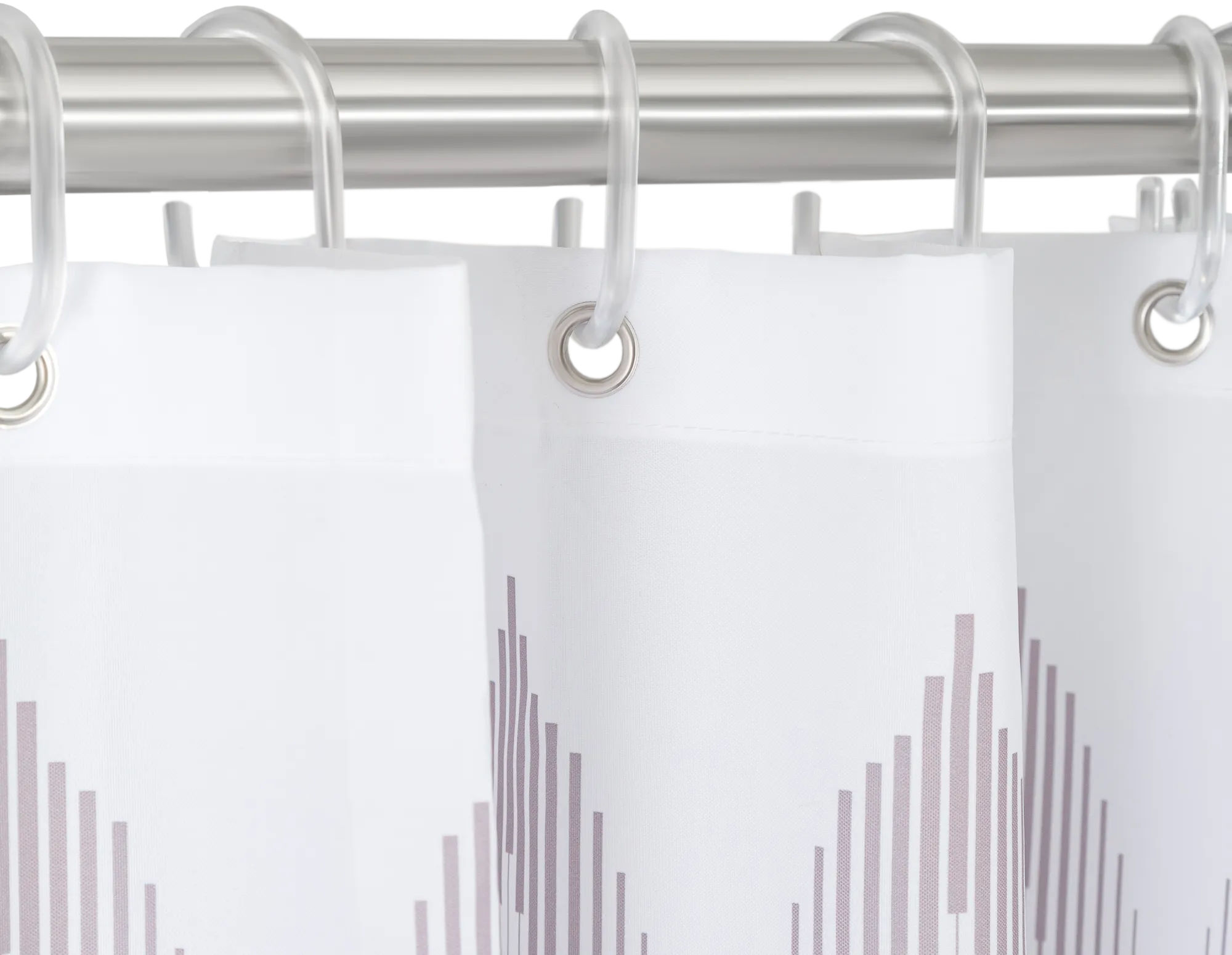 Шторка, изготовленная из износостойкого полиэстера с водоотталкивающей пропиткой, не только защитит помещение ванной от влаги, но и придаст ему элегантный вид. Завораживающий геометрический узор и пастельные цвета добавят впечатление изысканности и шарма в ванной комнате.
