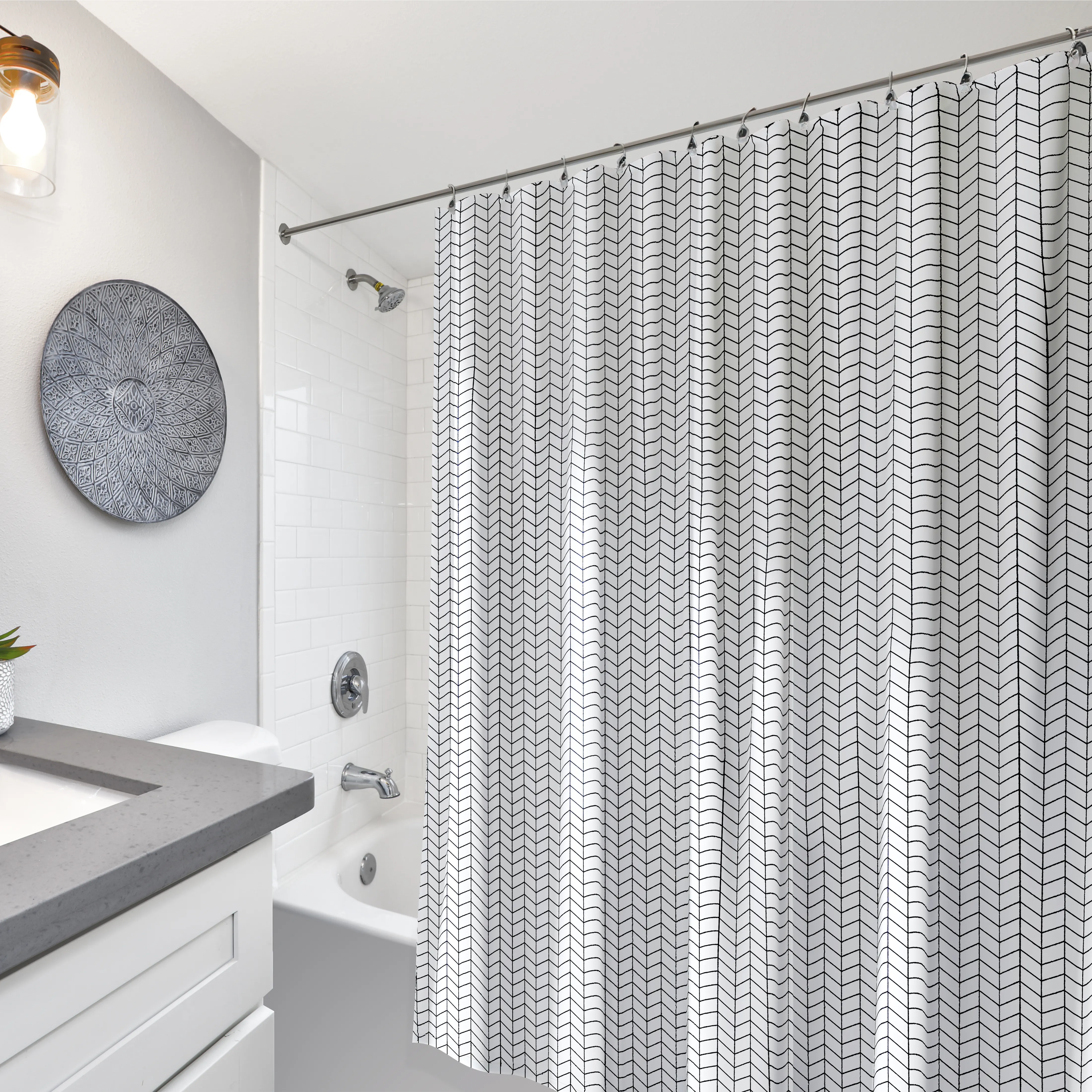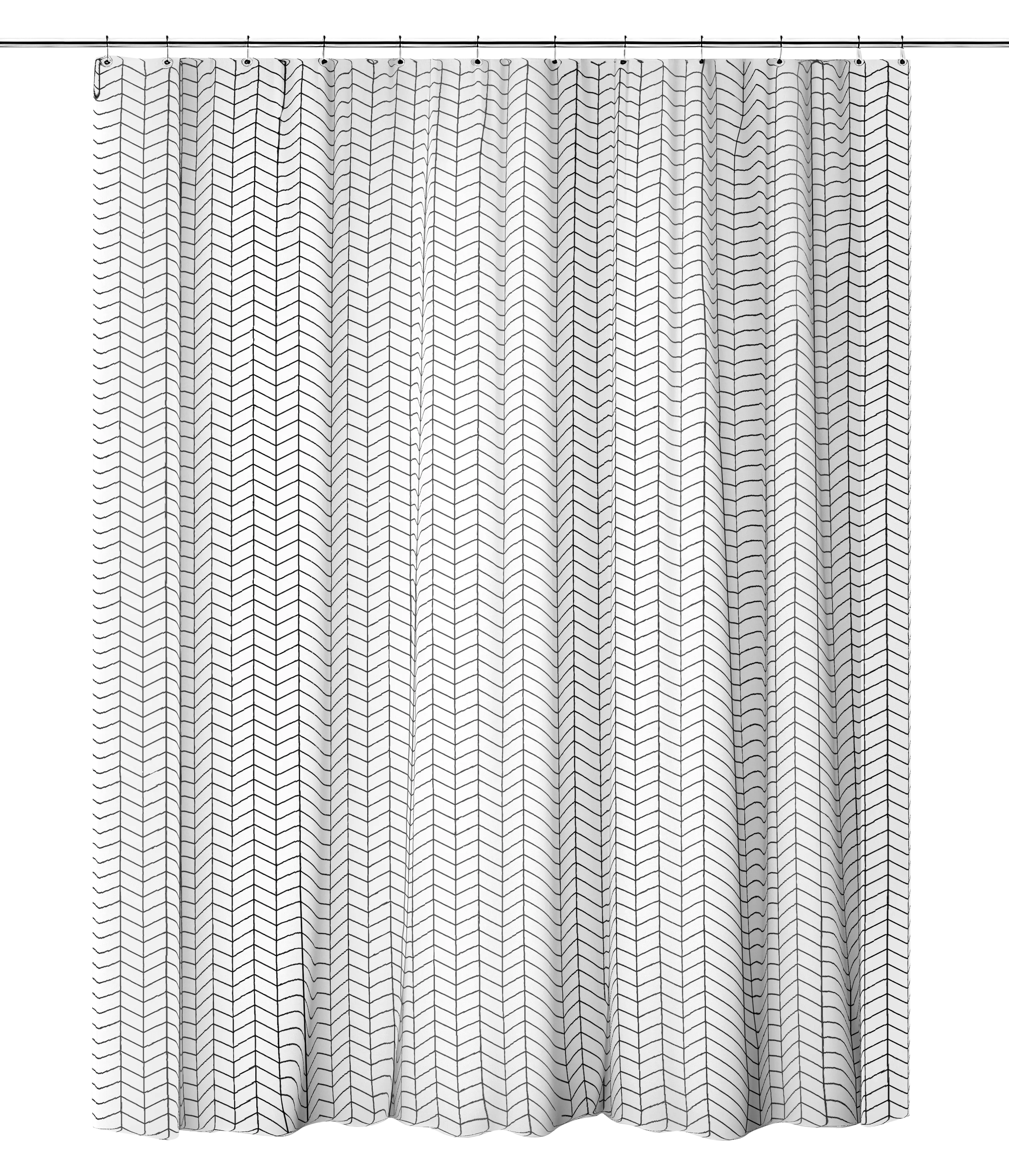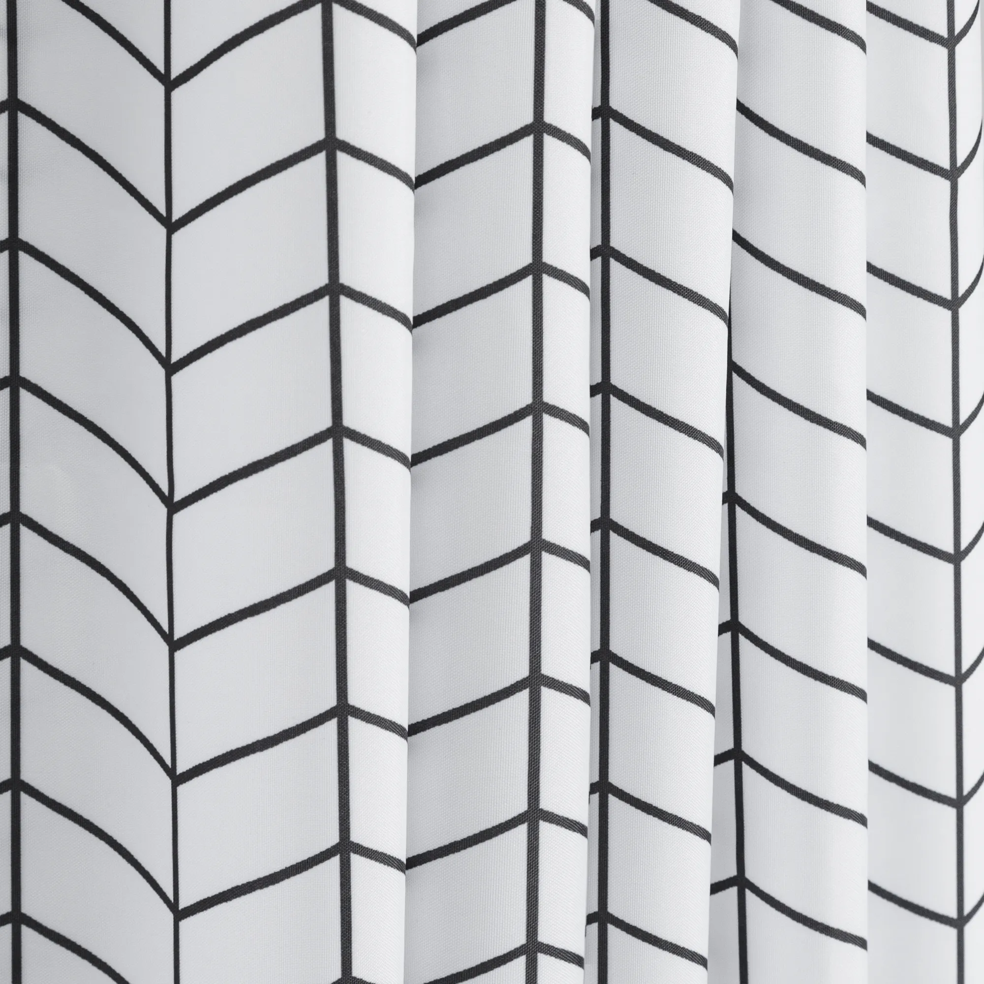 Четкий геометрический узор в сдержанном черном цвете и выдержанный лаконичный дизайн подойдет к любому интерьеру. Тканевая штора, изготовленная из качественного полиэстера с водоотталкивающим покрытием, надежно защитит от брызг и влаги.