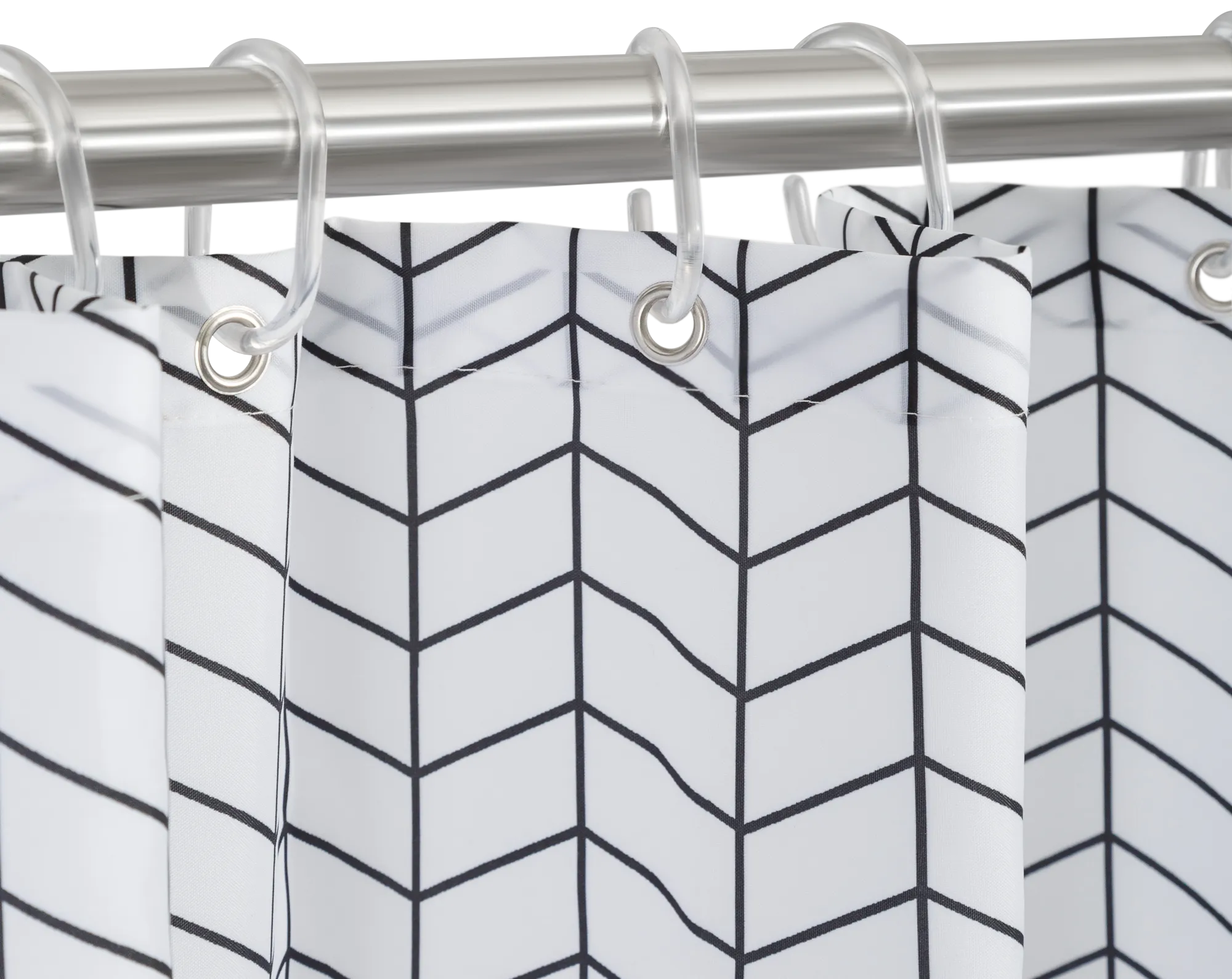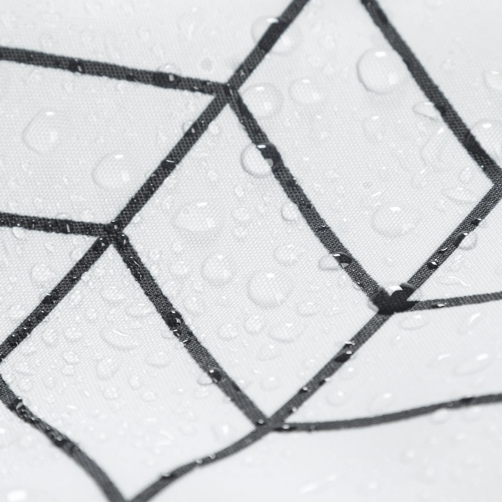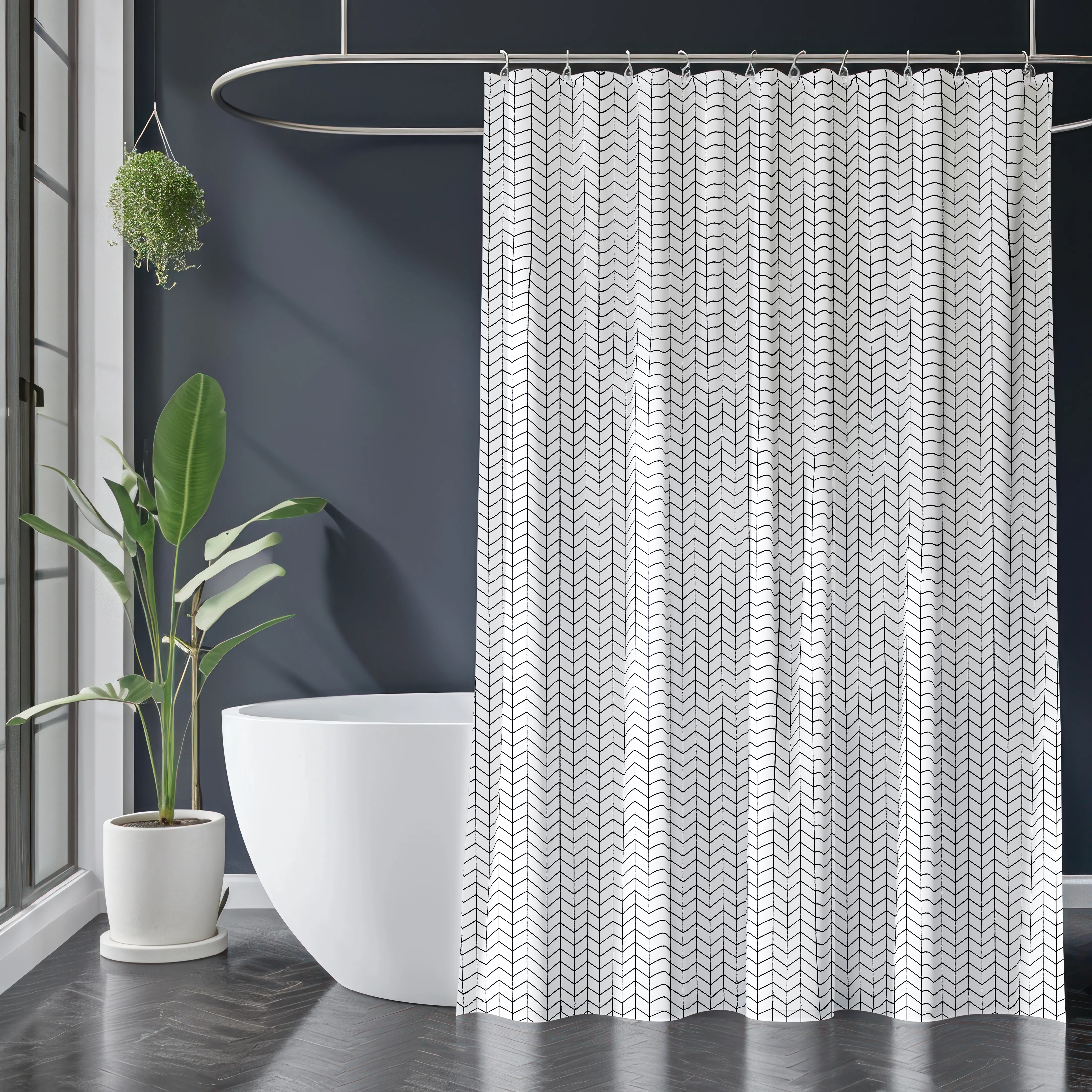 Четкий геометрический узор в сдержанном черном цвете и выдержанный лаконичный дизайн подойдет к любому интерьеру. Тканевая штора, изготовленная из качественного полиэстера с водоотталкивающим покрытием, надежно защитит от брызг и влаги.