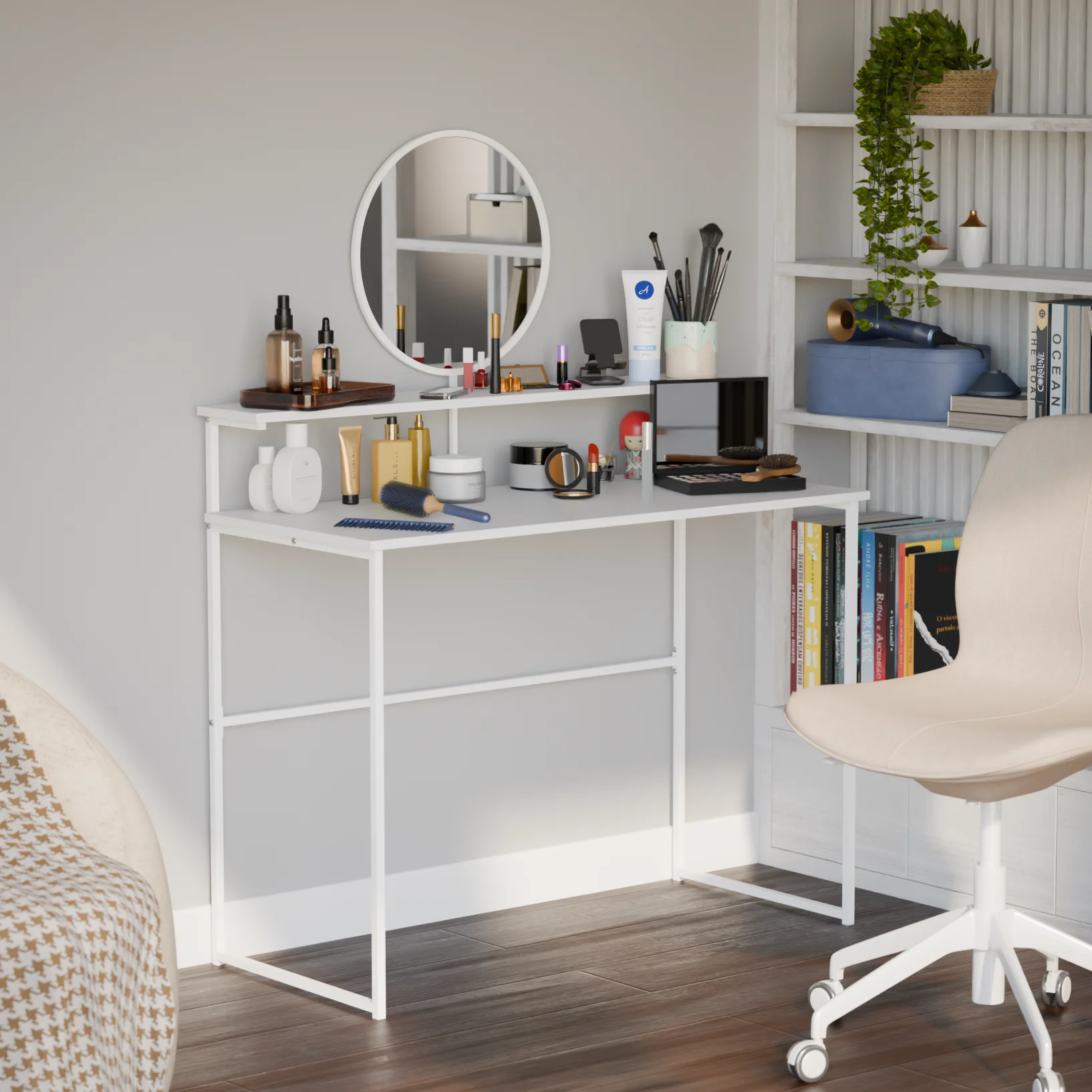 Туалетный столик Aurora поможет держать все аксессуары для макияжа и личные мелочи организованными и под рукой. Компактный размер делает его идеальным для небольшой спальни, не загромождая пространство, а аккуратный дизайн добавляет комнате лёгкости и уюта. Используя столик Aurora, вы создадите порядок и чистоту в интерьере, превращая процесс утренних сборов в удовольствие.