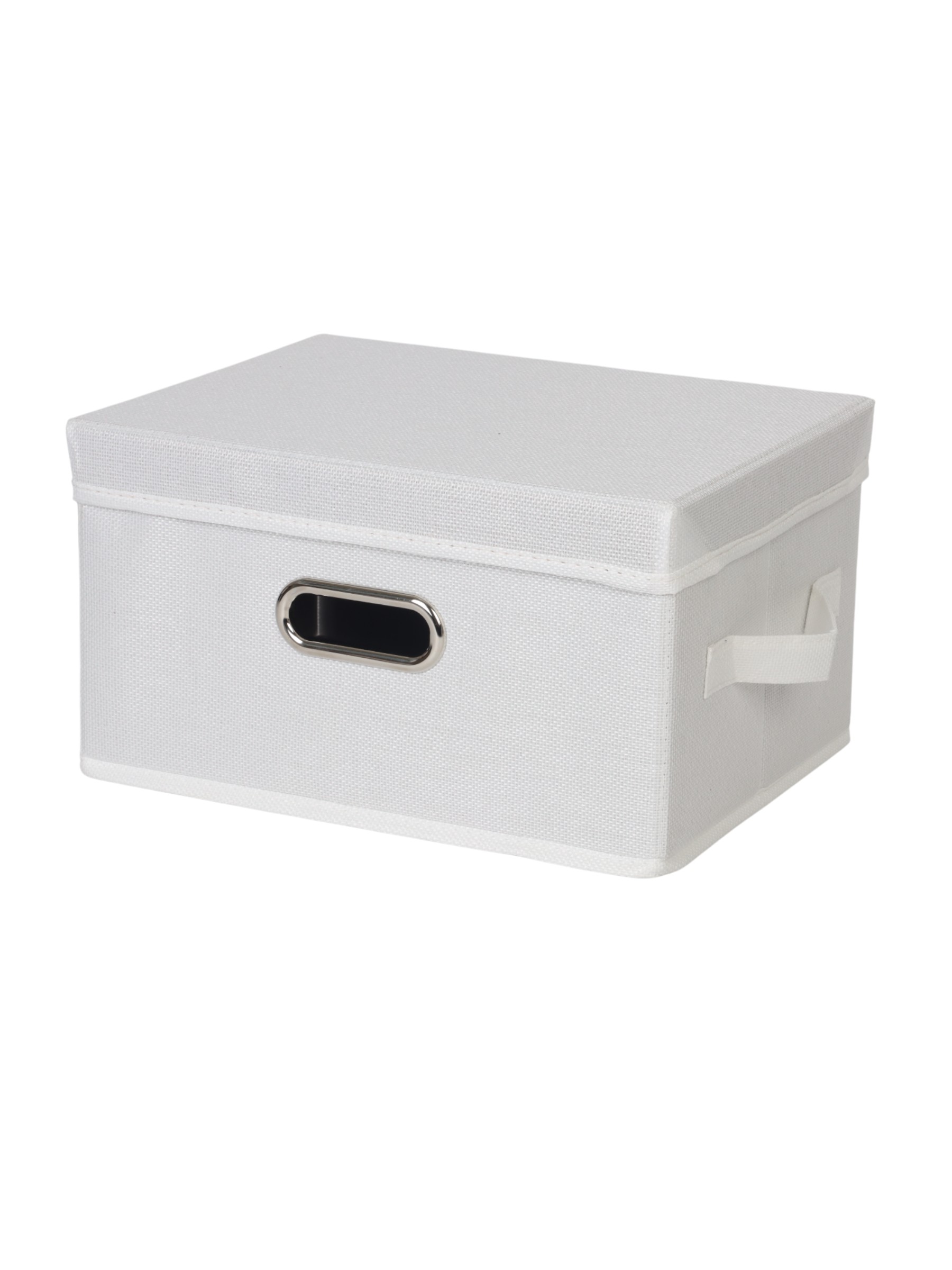 Кофр для хранения вещей и организации пространства в вашем доме. Интегрированная металлическая ручка для комфортного использования. Жесткий каркас обшит материалом, структура которого напоминает лен.