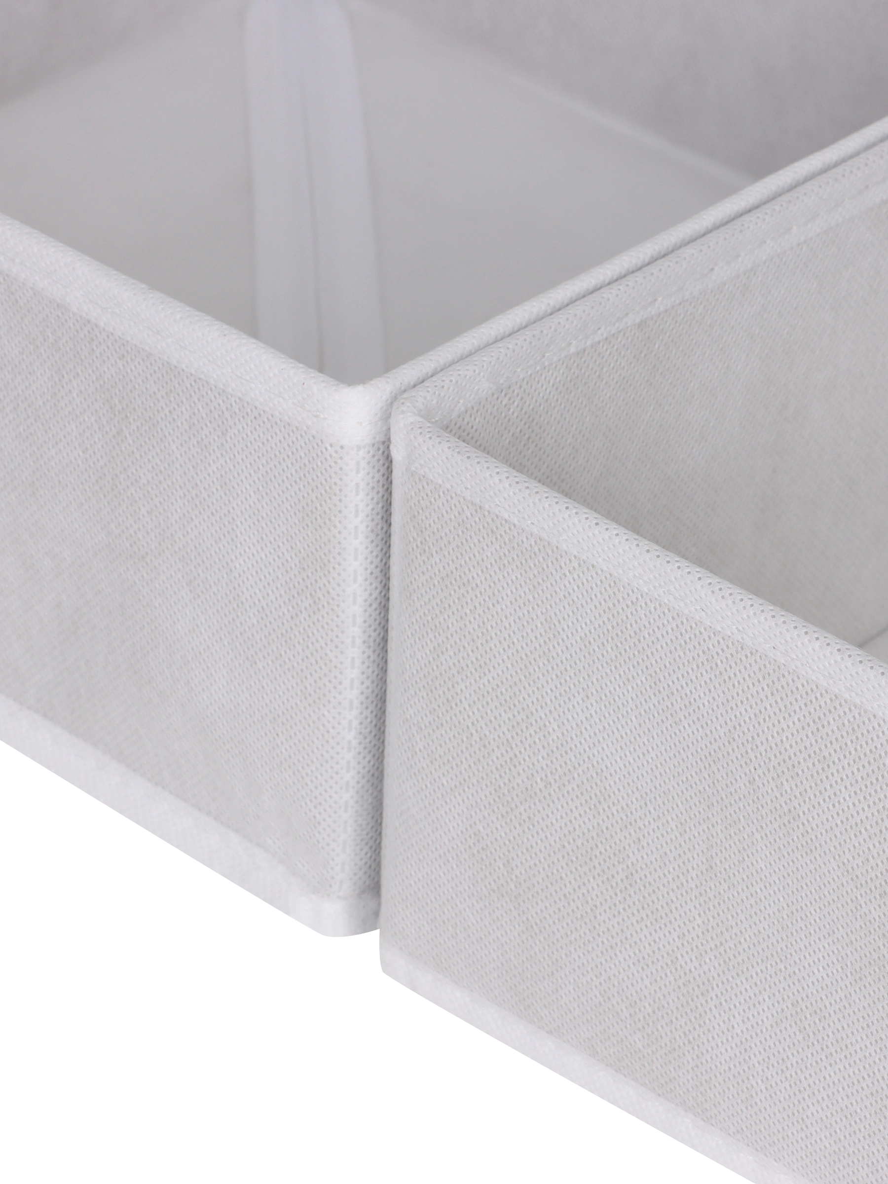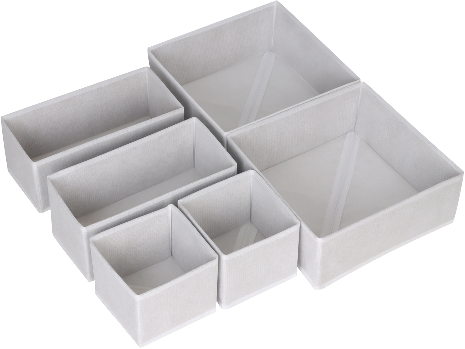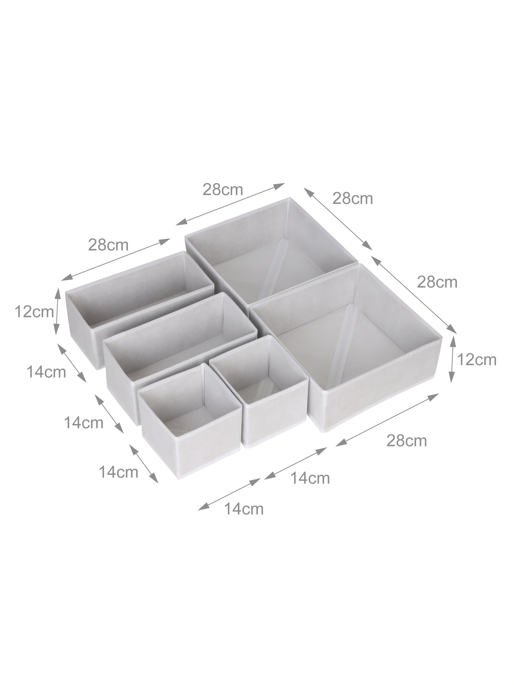 Набор для хранения вещей и белья состоит из 6 органайзеров, каждый из которых обеспечивает рациональное использование места в шкафу. Благодаря складной форме и универсальным размерам организуется компактное и рациональное хранение на полках.