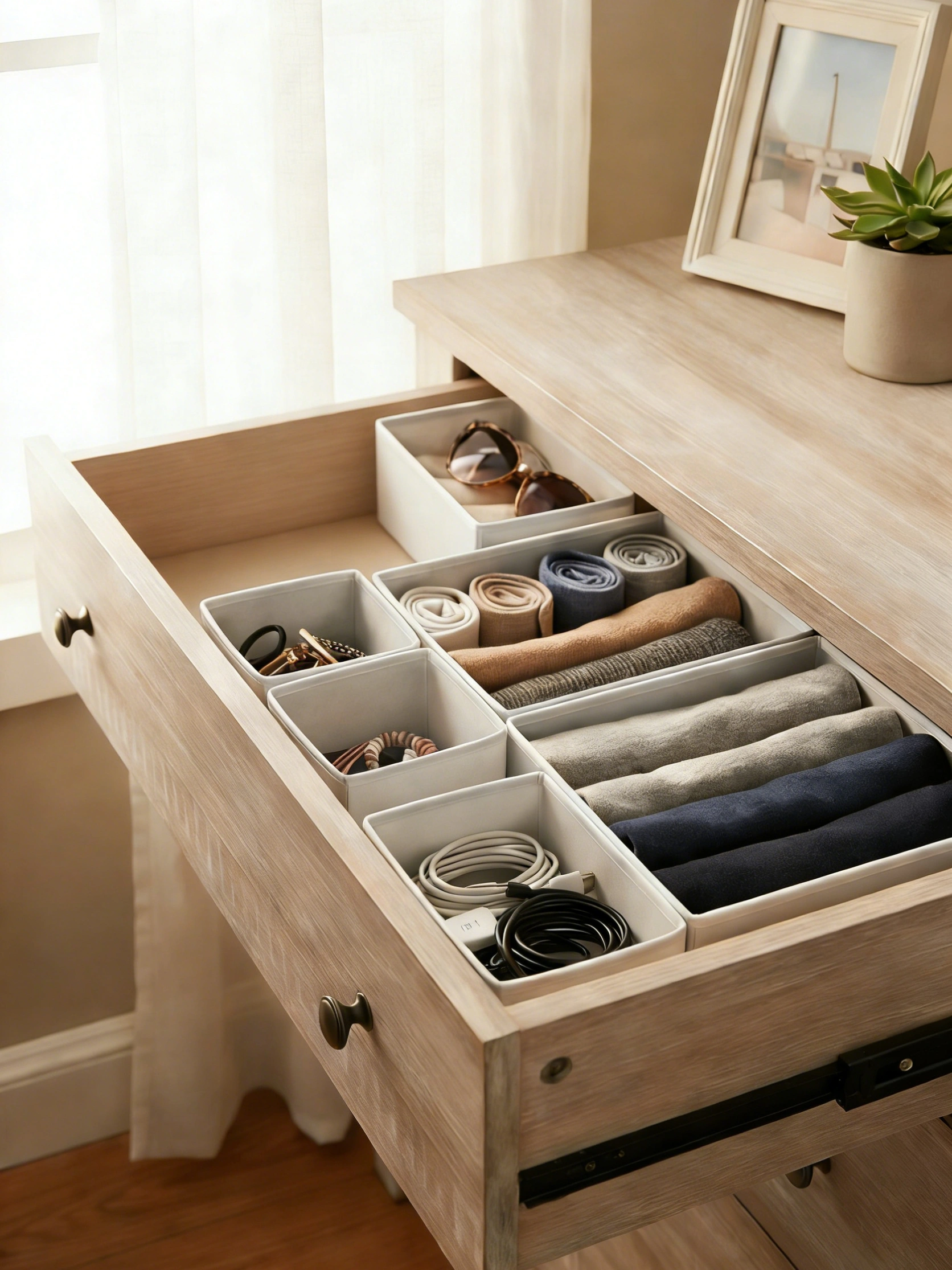 Органайзеры позволяют разделить белье по категориям и поддерживать порядок в ящике все время