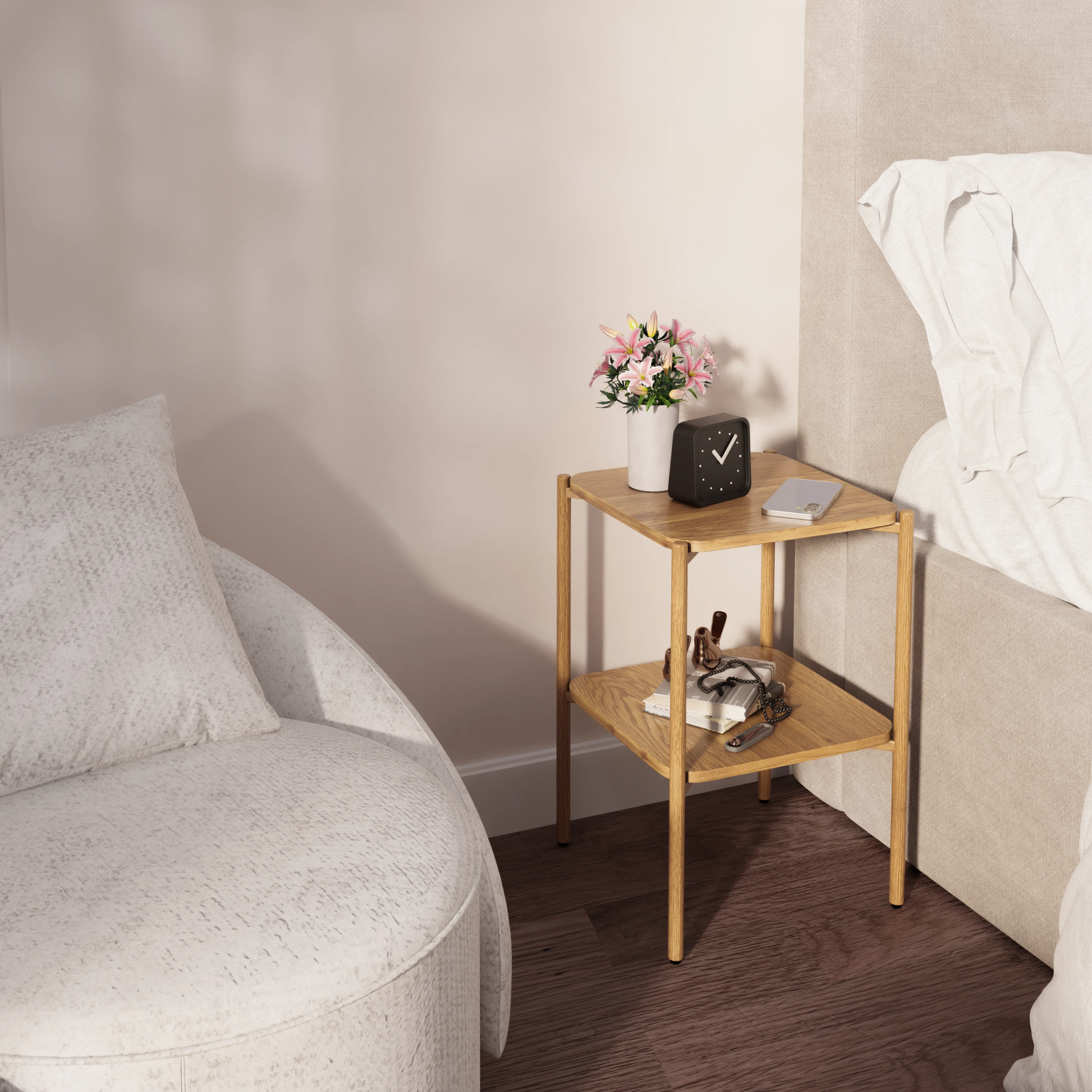 Трендовый журнальный столик в актуальной эстетике Japandi — воплощение современного минимализма с теплым характером натурального дерева. Лаконичная геометрия и изящный металлический каркас создают ощущение легкости, а древесная текстура придает интерьеру глубину и уют. Модель органично вписывается в пространство спальни, гостиной или рабочего кабинета, становясь не просто системой хранения, а стильным акцентом интерьера. Все элементы конструкции покрыты меламиновой пленкой с высокоточной имитацией фактуры натурального дерева. Такое решение объединяет эстетику природного материала и практичность современного покрытия: поверхность устойчива к износу, проста в уходе и сохраняет безупречный внешний вид на протяжении долгого времени.