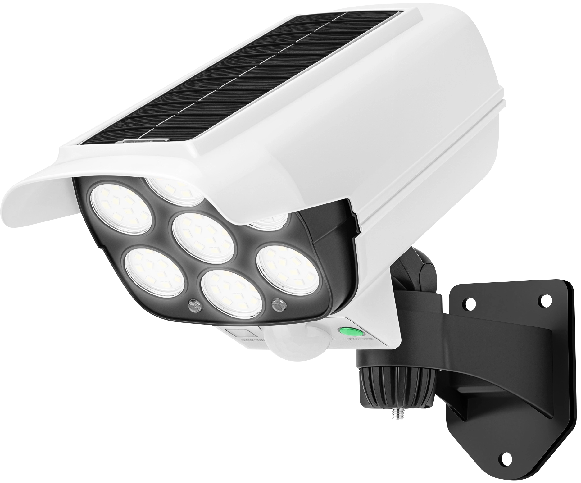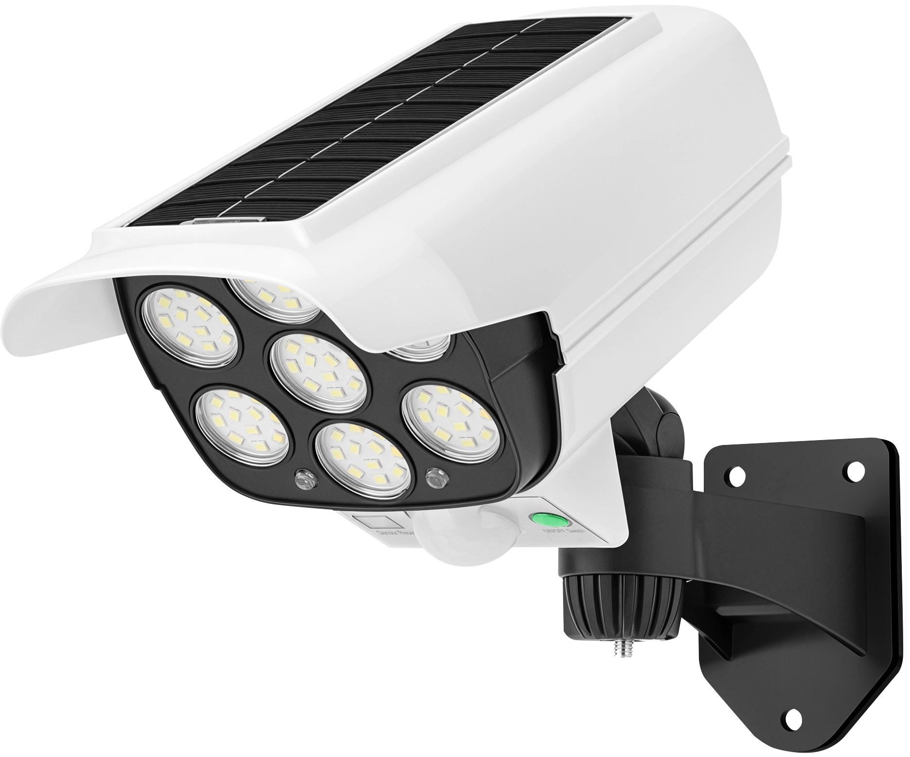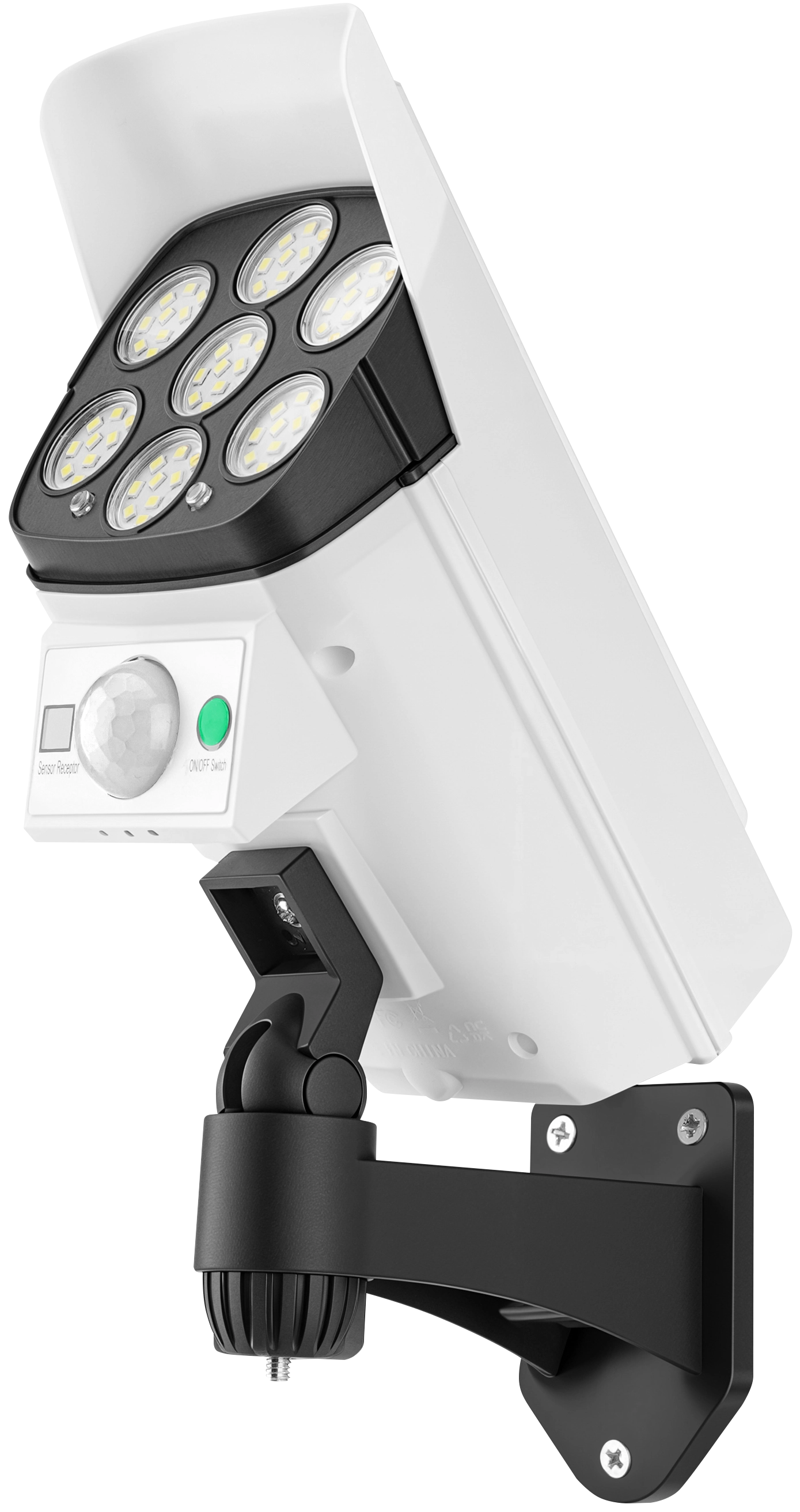 Садовый светодиодный светильник в виде видеокамеры с солнечной батареей, датчиком движения и датчиком света для безопасного освещения и декоративного акцента. Работает полностью автономно от встроенной солнечной панели: днём аккумулирует энергию, а в тёмное время суток автоматически включается. Оснащён имитацией камеры с мигающим красным огоньком, создавая эффект присутствия настоящей системы видеонаблюдения и отпугивая нежелательных гостей.