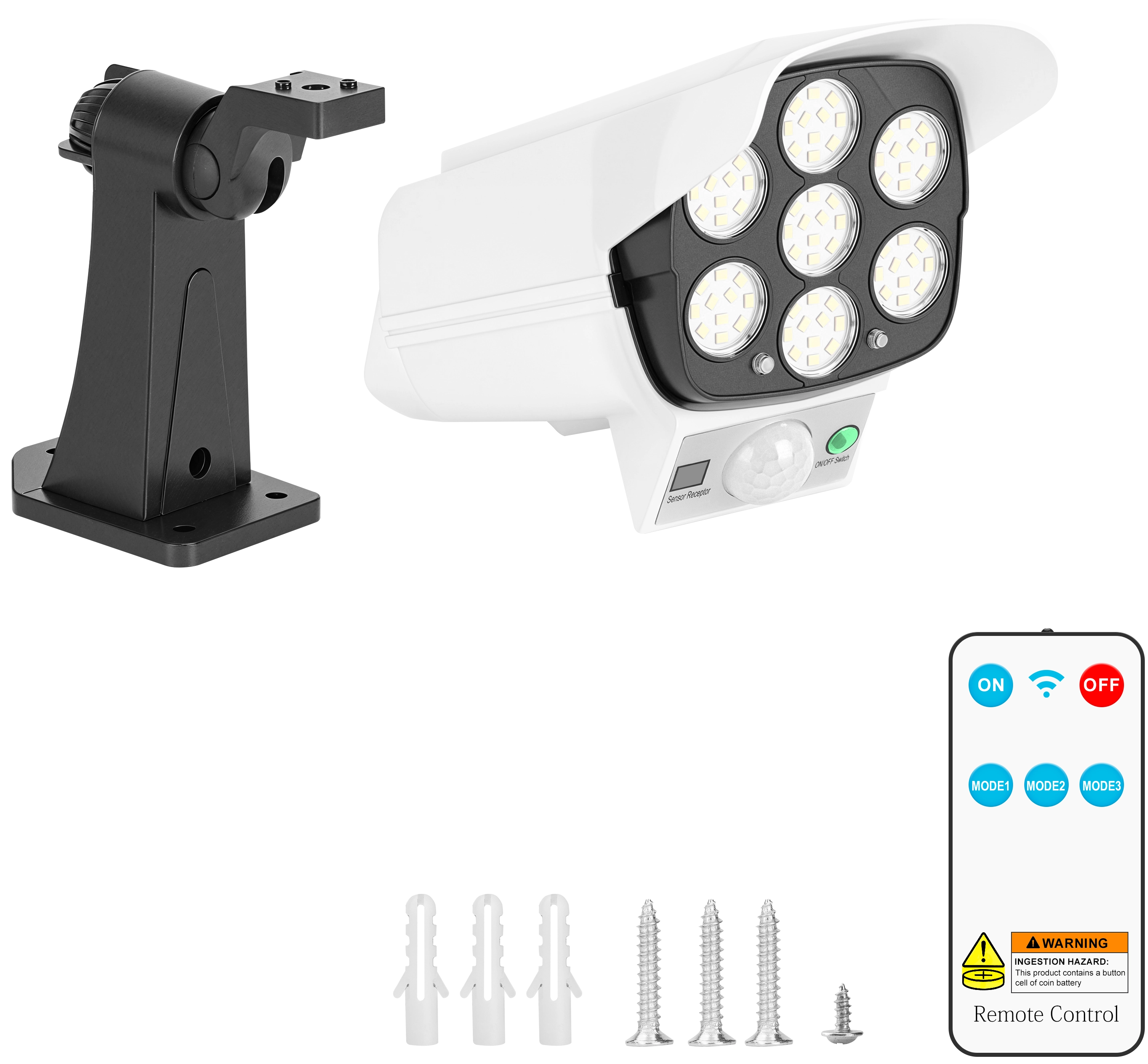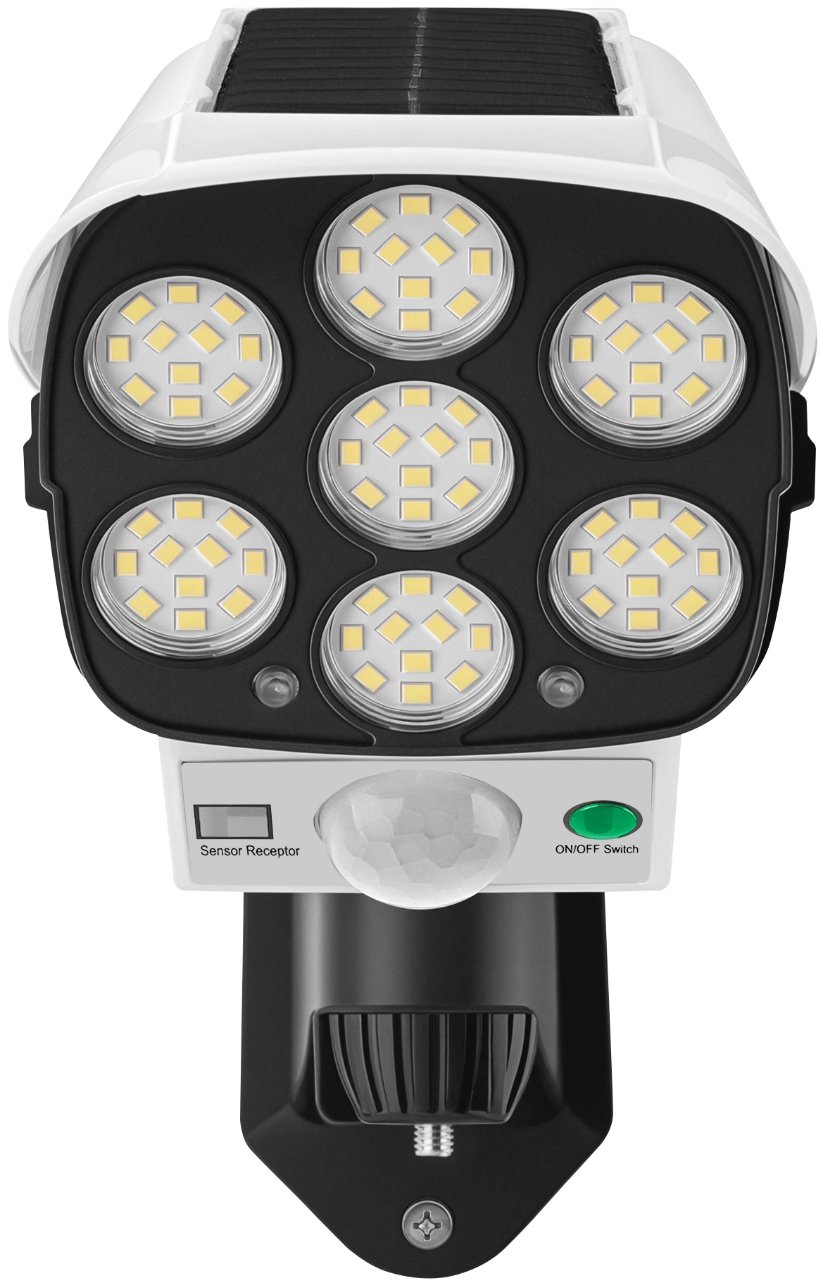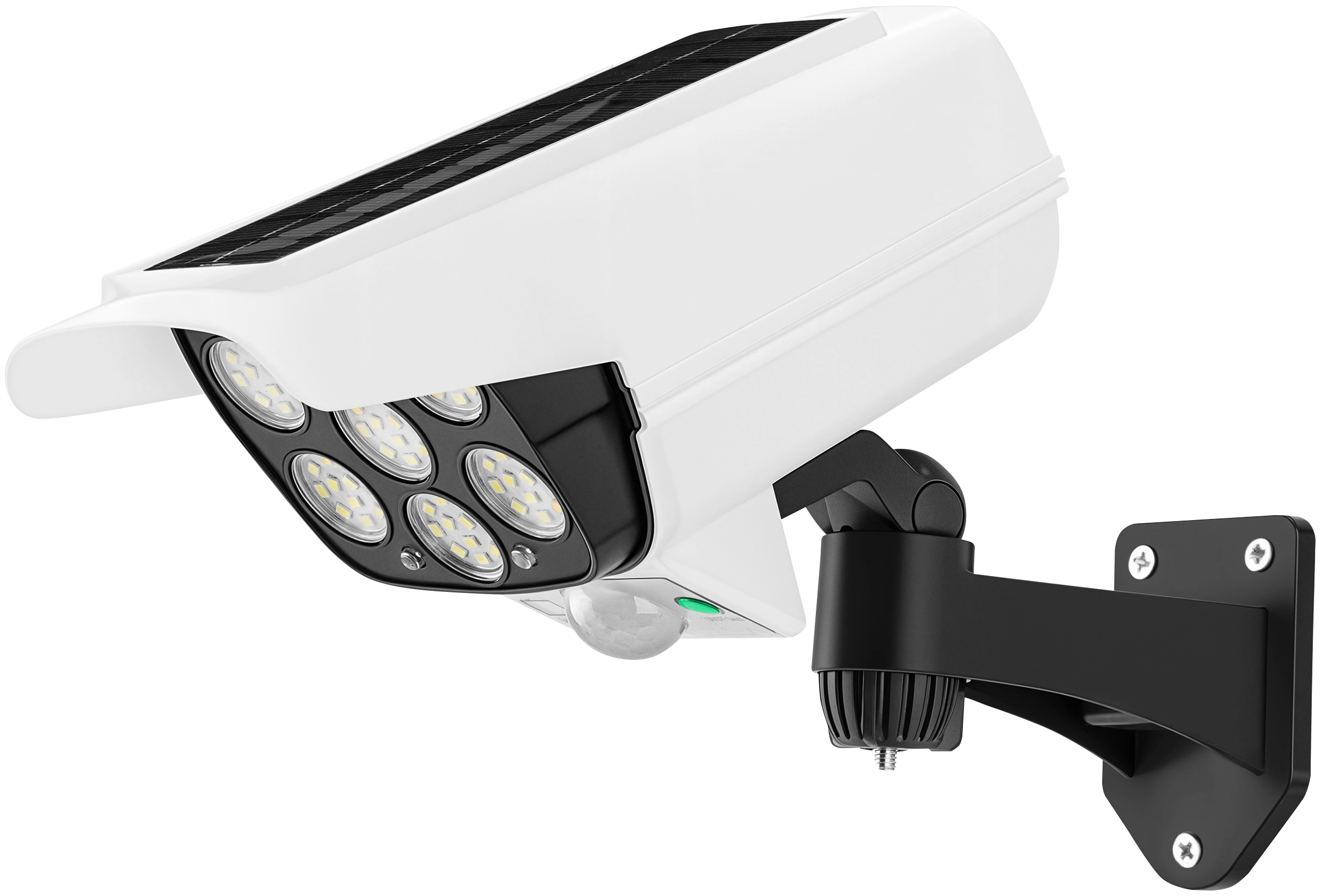 Садовый светодиодный светильник в виде видеокамеры с солнечной батареей, датчиком движения и датчиком света для безопасного освещения и декоративного акцента. Работает полностью автономно от встроенной солнечной панели: днём аккумулирует энергию, а в тёмное время суток автоматически включается. Оснащён имитацией камеры с мигающим красным огоньком, создавая эффект присутствия настоящей системы видеонаблюдения и отпугивая нежелательных гостей.