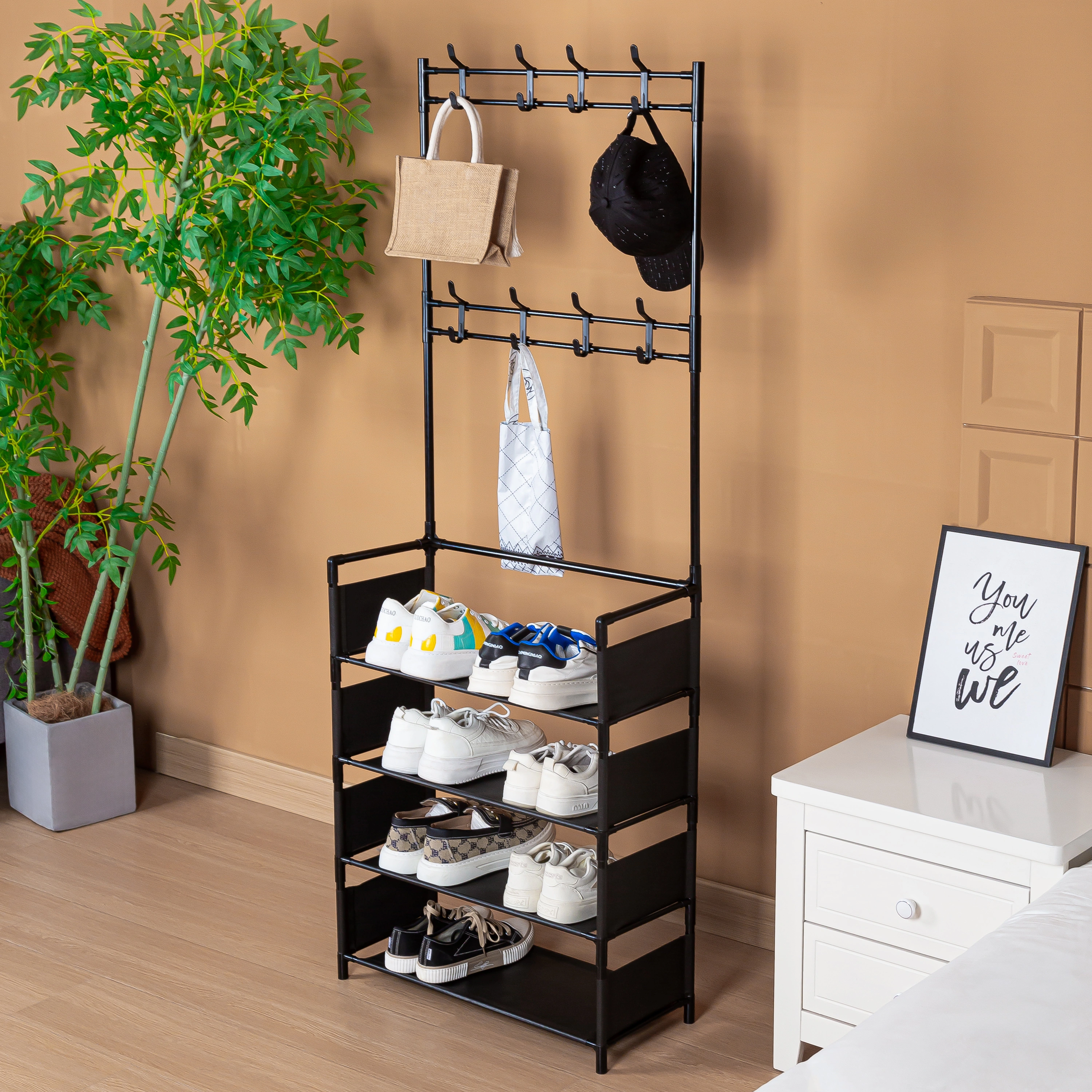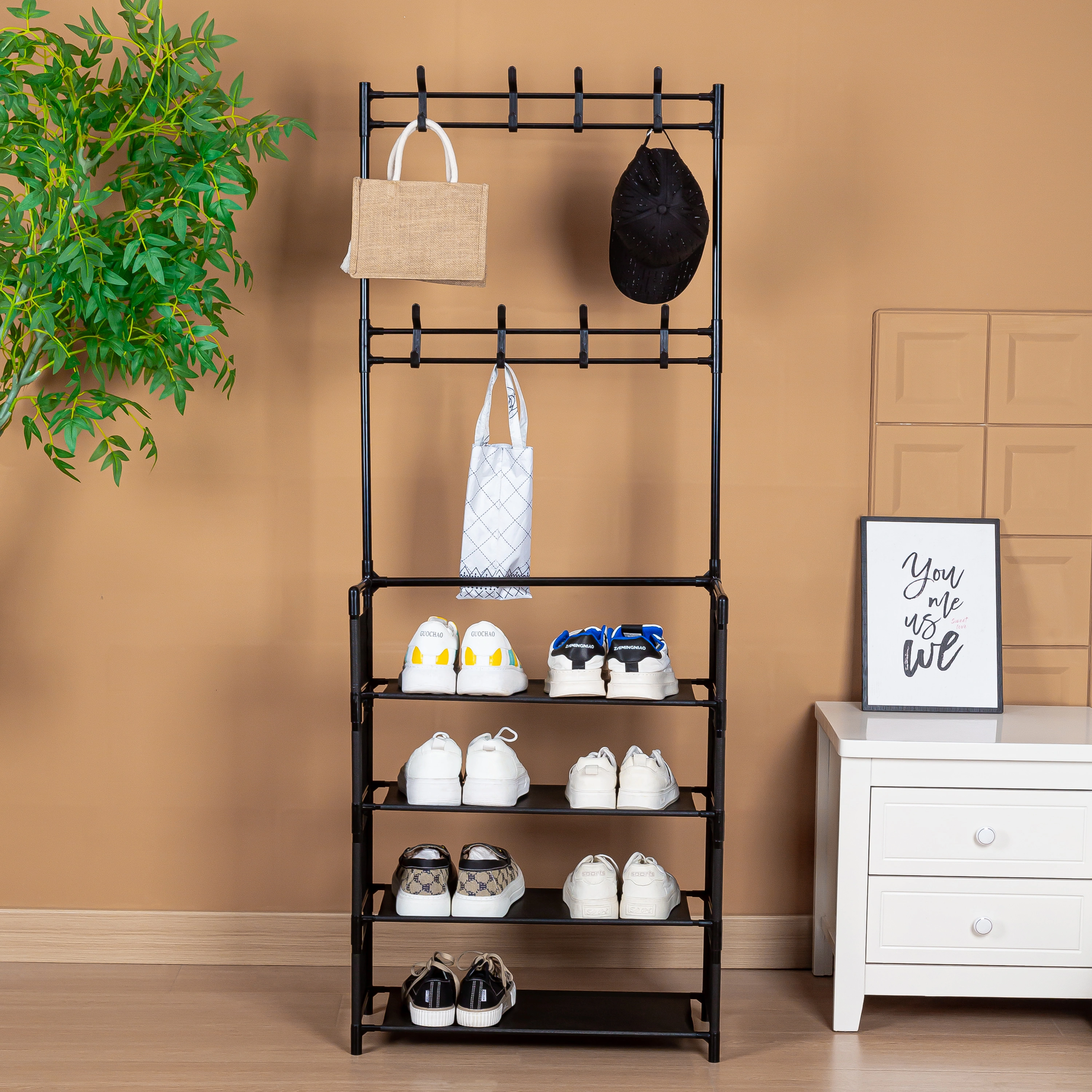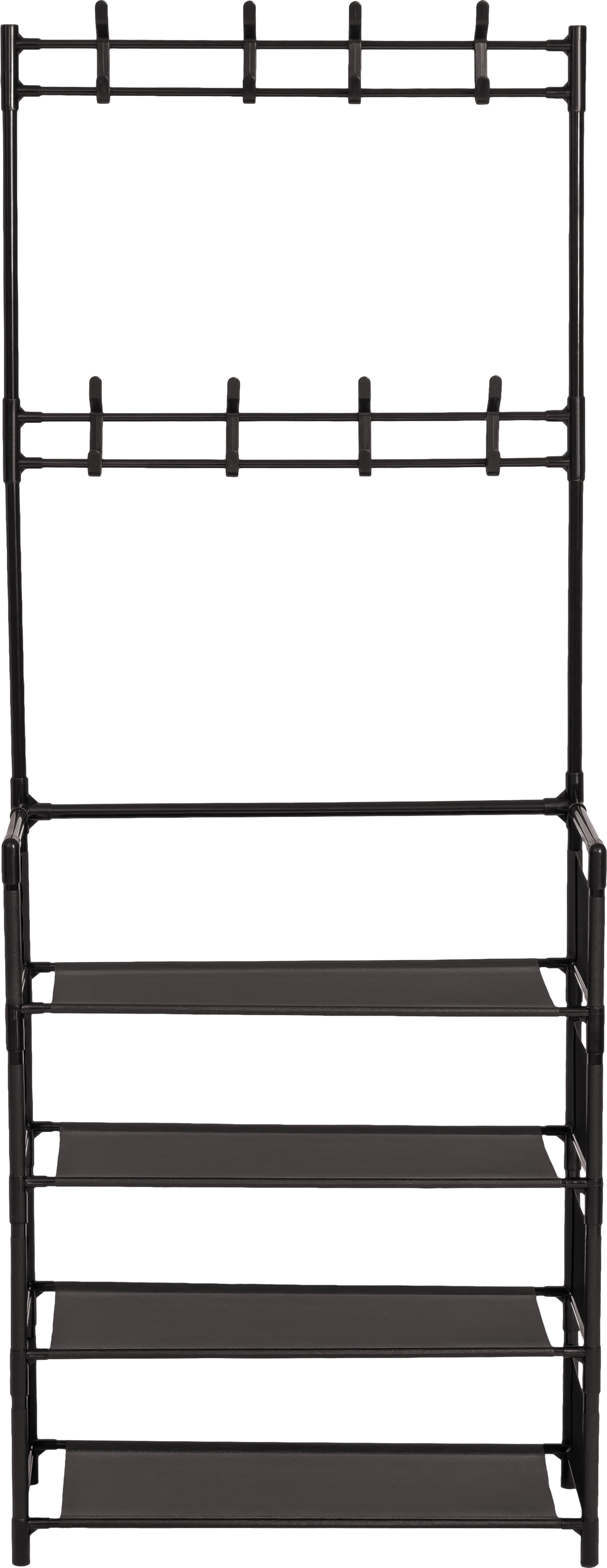 Эта вешалка для обуви с полками и крючками идеально подходит для организации вашего пространства. С четырьмя вместительными полками для обуви и несколькими крючками для сумок, шапок и других аксессуаров, она поможет поддерживать порядок в прихожей, коридоре или даже в спальне. Легкая и компактная конструкция позволяет разместить её в любом месте вашего дома, а стильный черный цвет и современный дизайн хорошо впишутся в любой интерьер. Изготовлена из прочного материала, эта вешалка будет служить вам долго, создавая порядок и удобство в повседневной жизни.