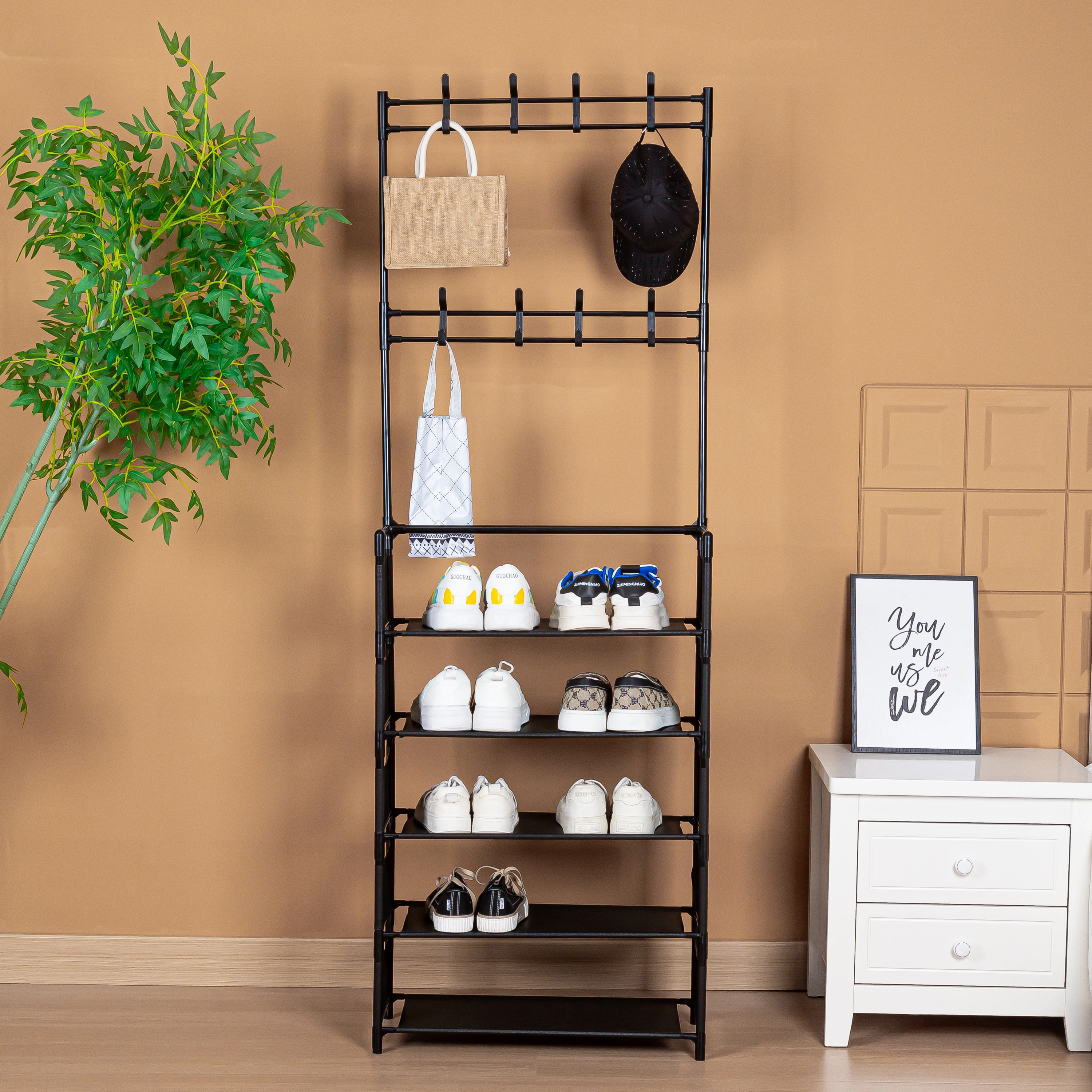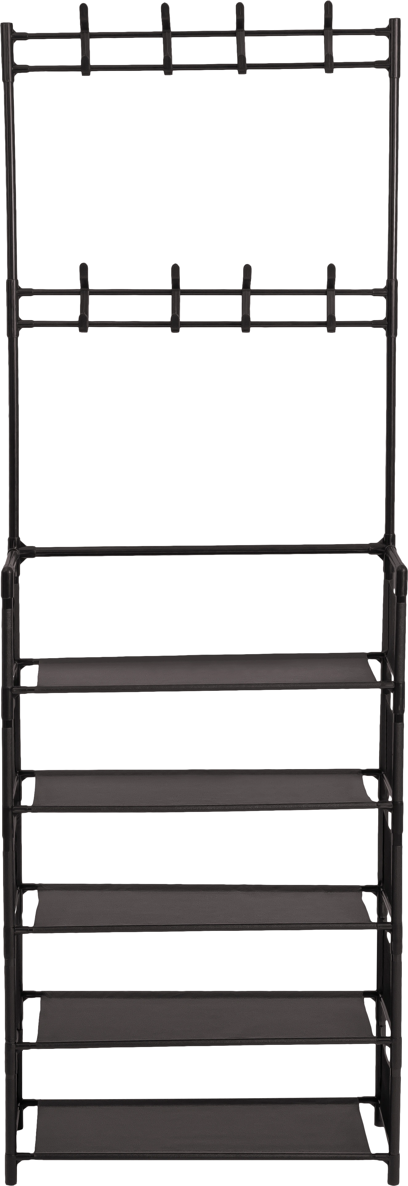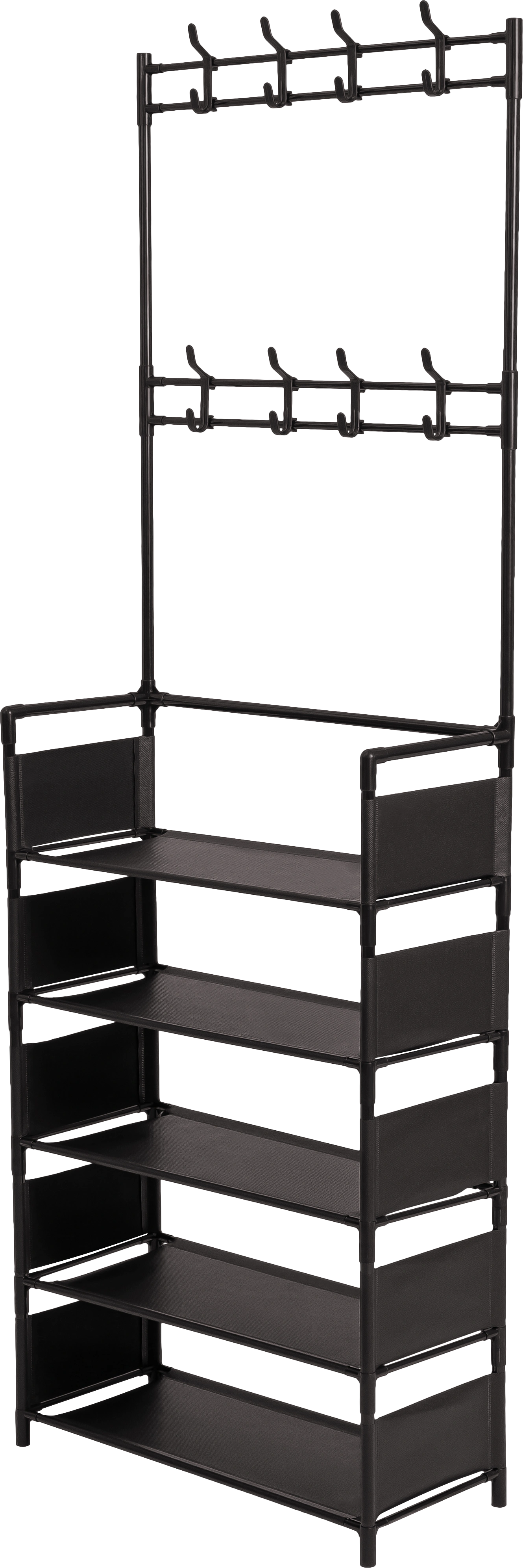 Эта вешалка для обуви с полками и крючками идеально подходит для организации вашего пространства. С пятью вместительными полками для обуви и несколькими крючками для сумок, шапок и других аксессуаров, она поможет поддерживать порядок в прихожей, коридоре или даже в спальне. Легкая и компактная конструкция позволяет разместить её в любом месте вашего дома, а стильный черный цвет и современный дизайн хорошо впишутся в любой интерьер. Изготовлена из прочного материала, эта вешалка будет служить вам долго, создавая порядок и удобство в повседневной жизни.