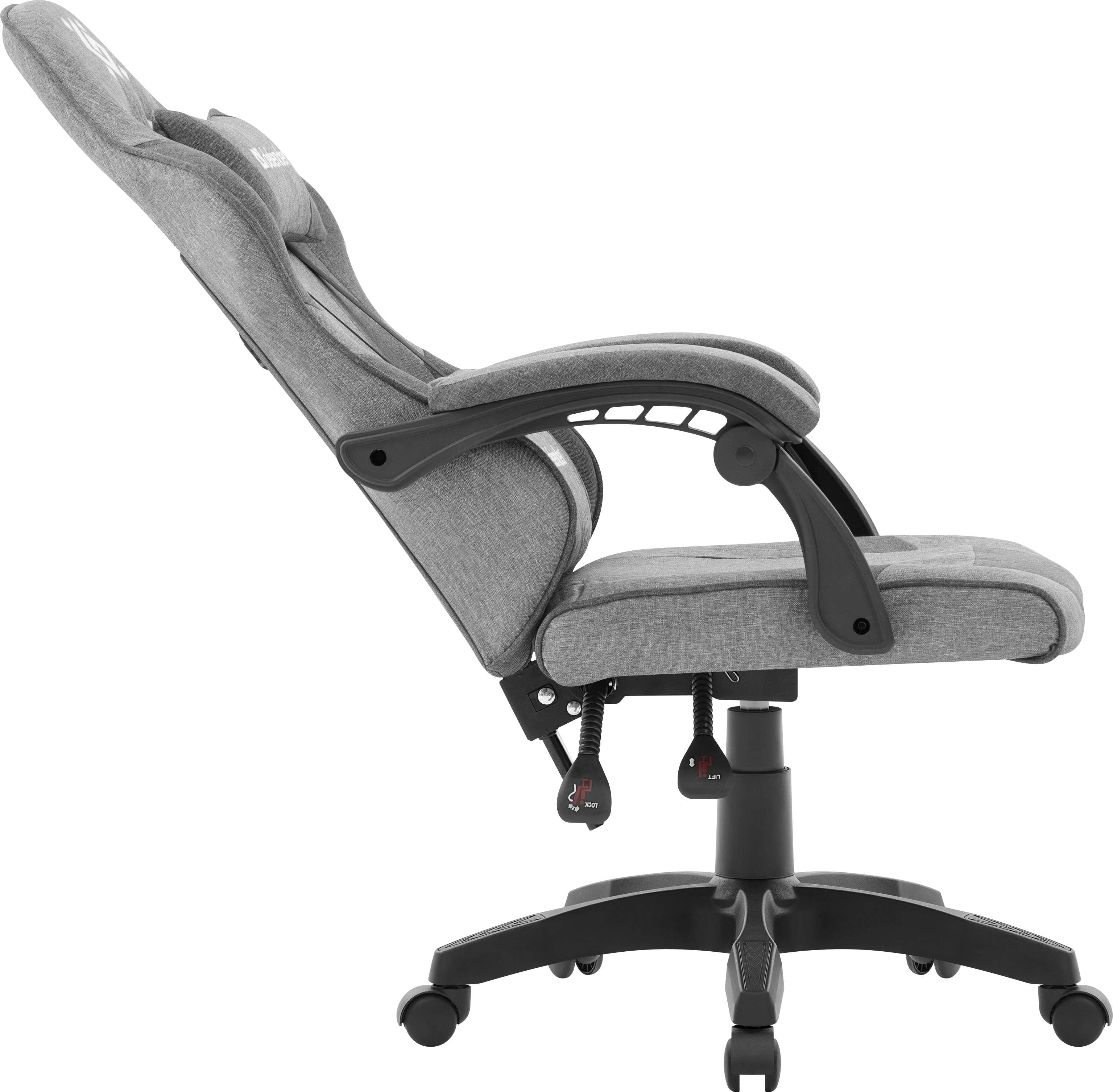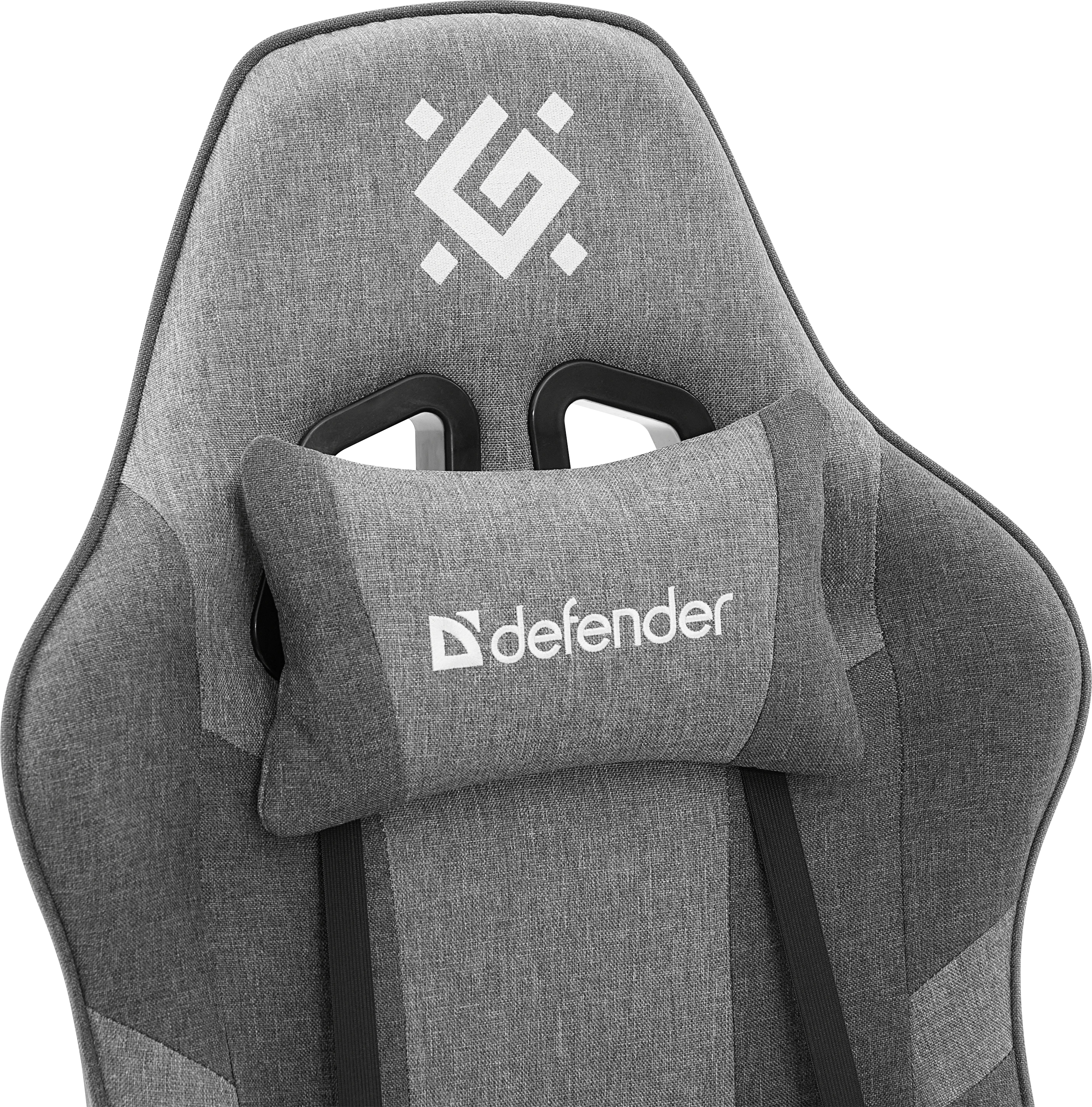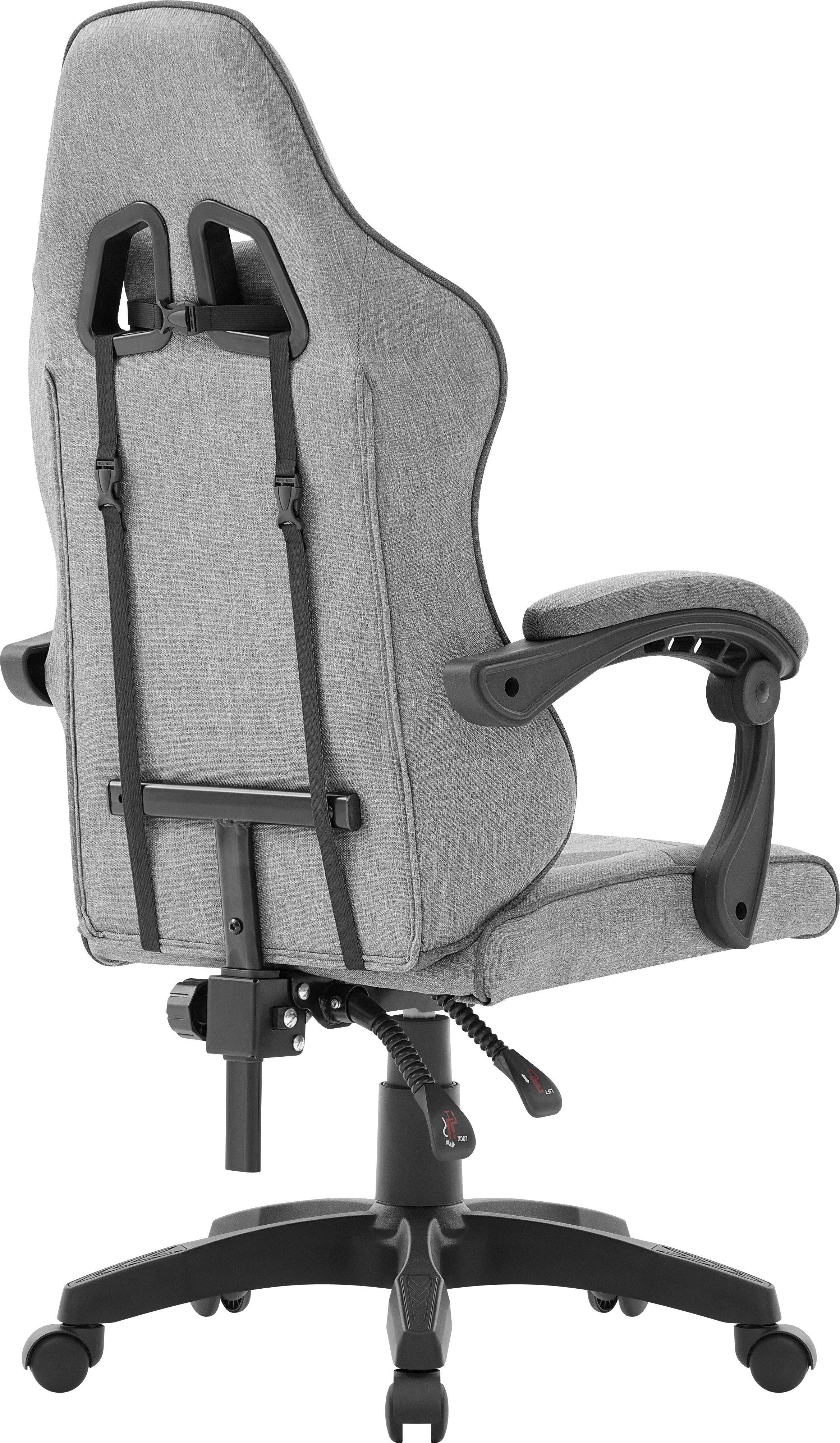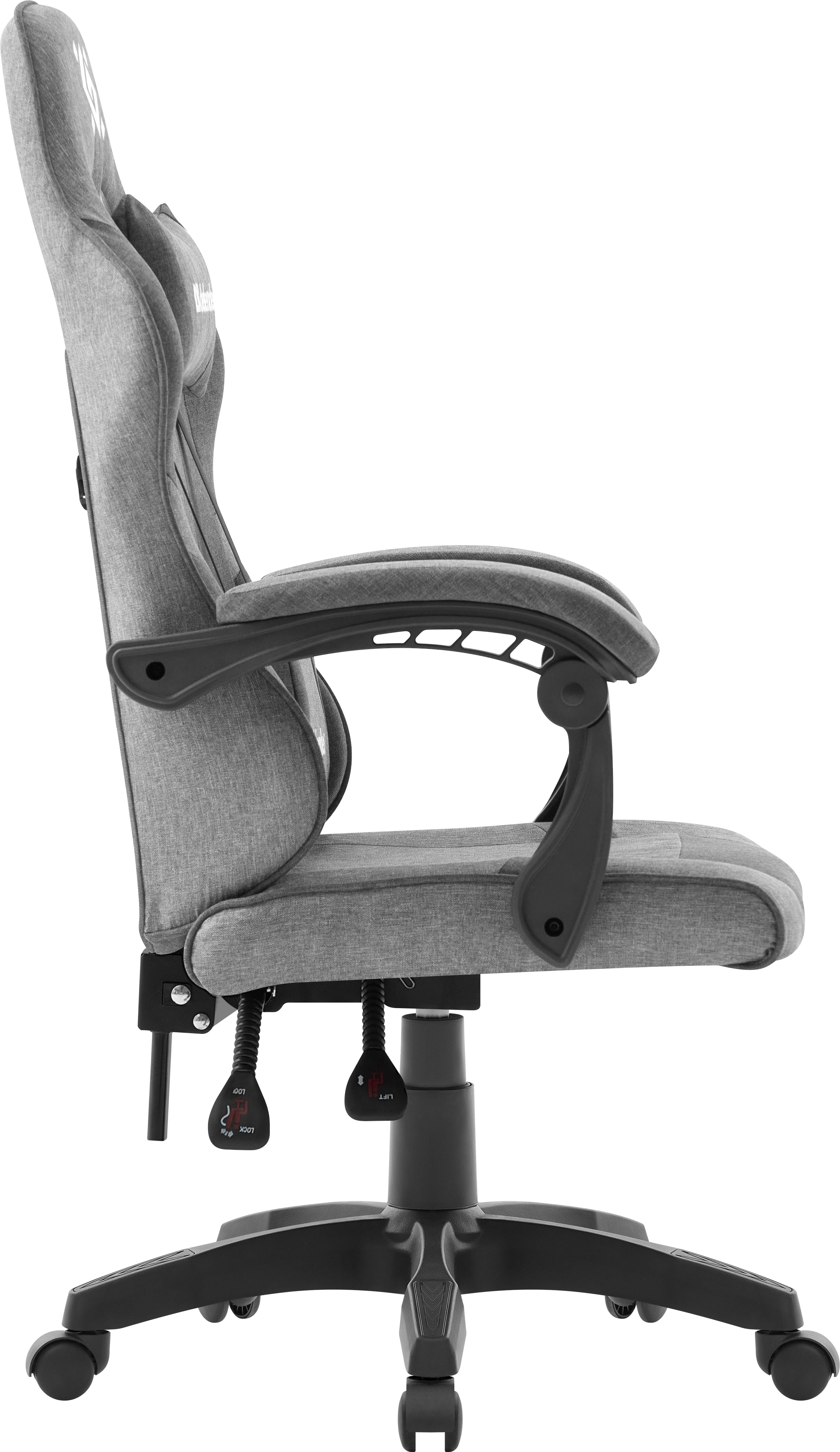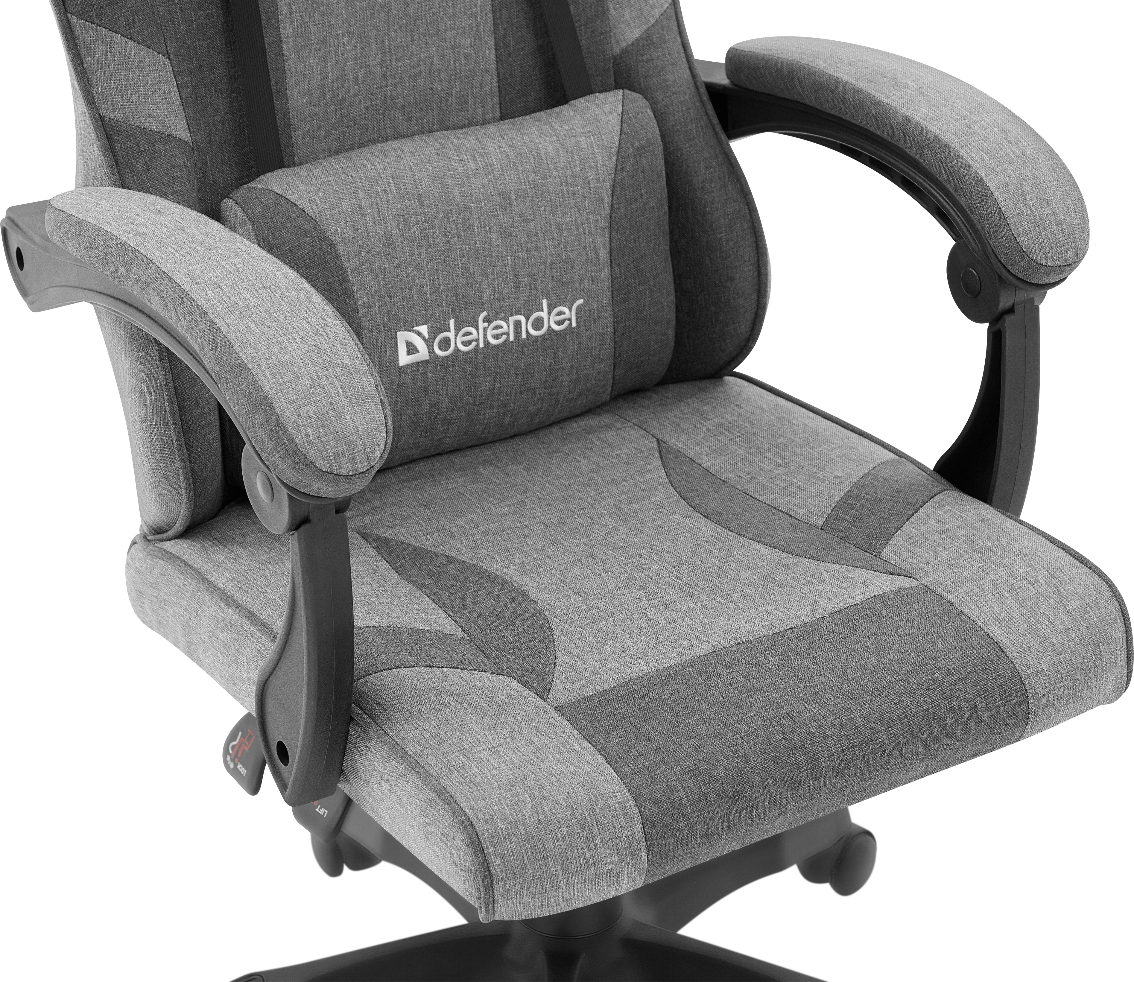 Стильное игровое кресло с мягкими подлокотниками и регулируемым наклоном спинки. В комплект входят шейная и поясничная подушки. Обивка выполнена из прочной мягкой ткани серого цвета.