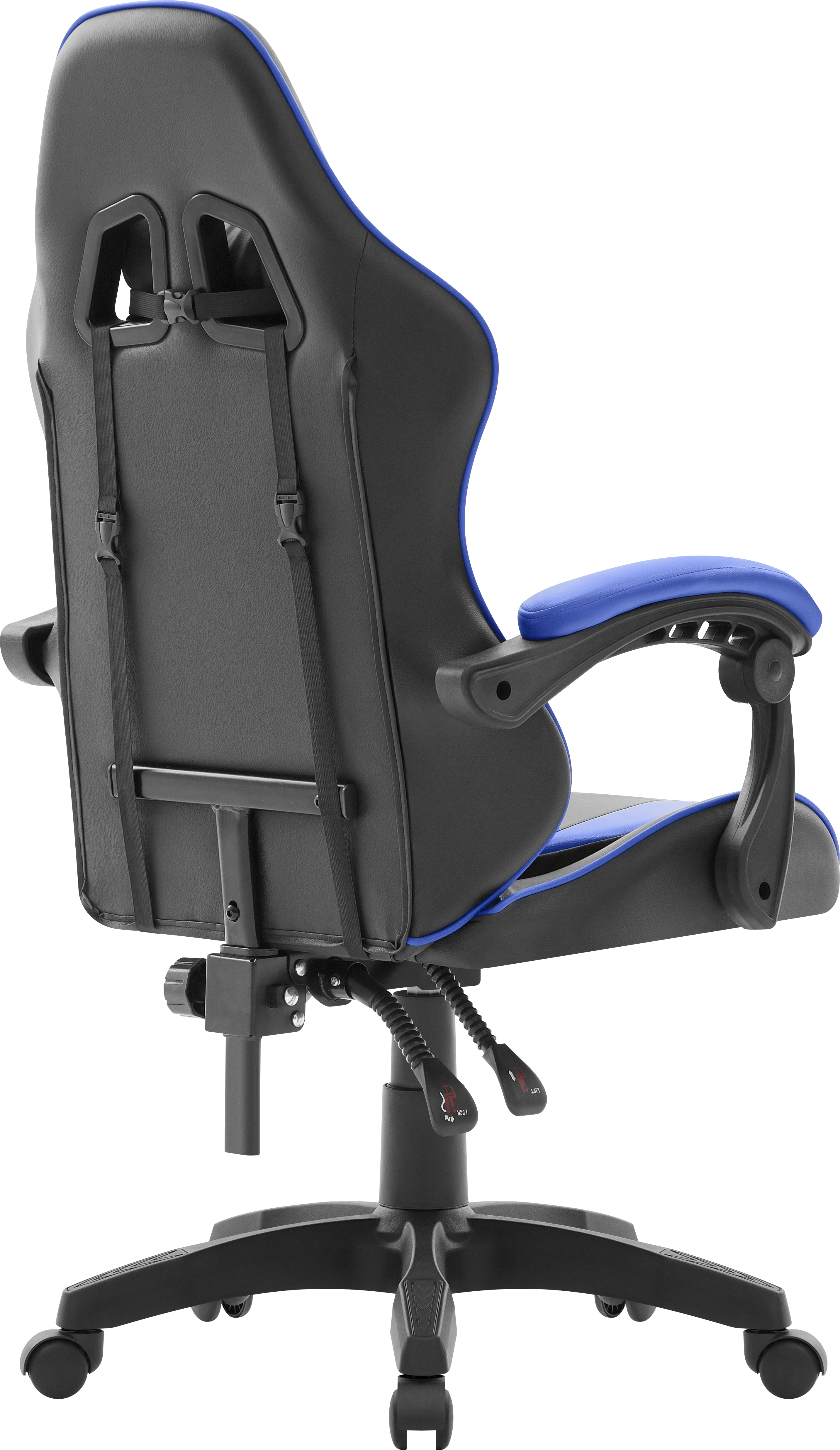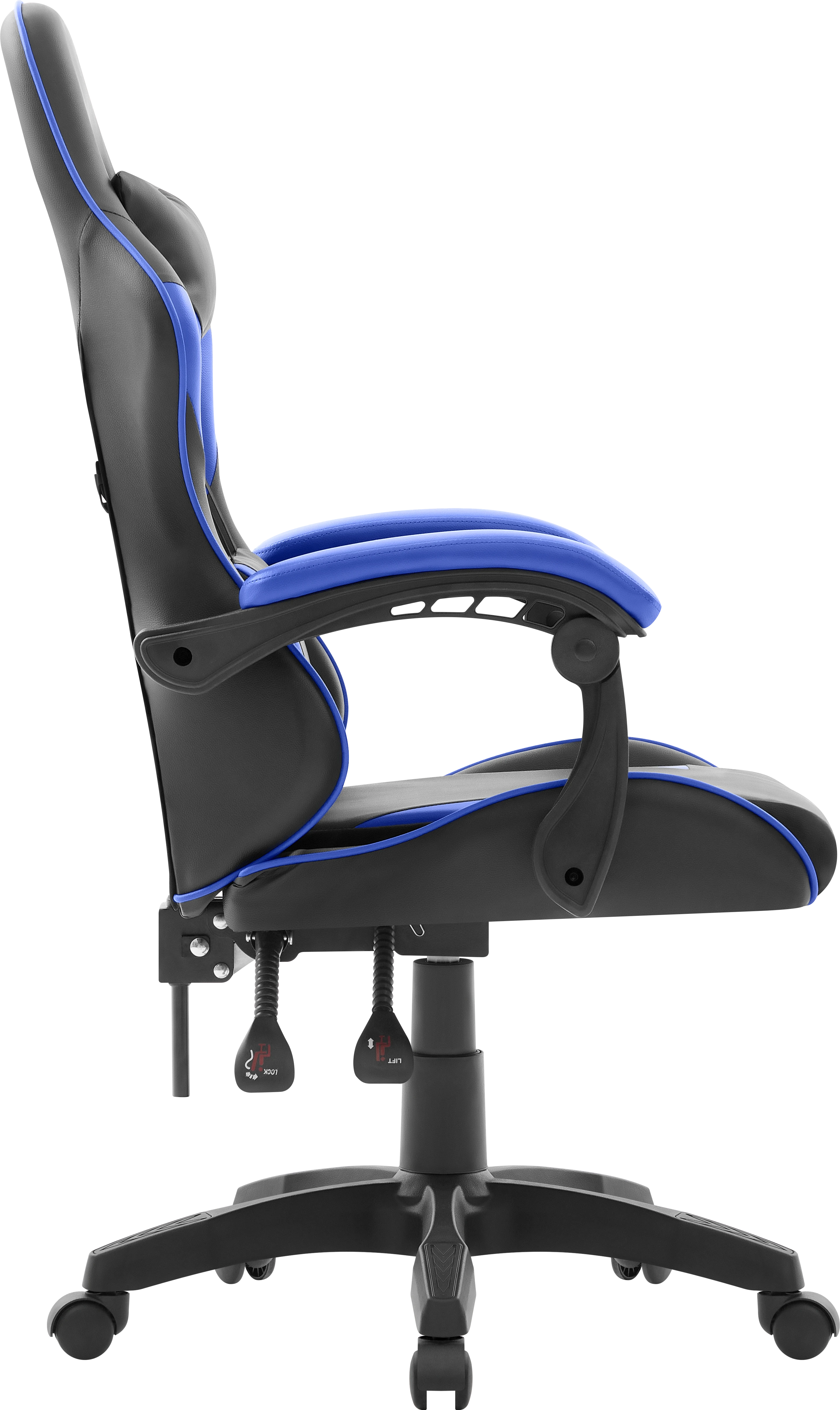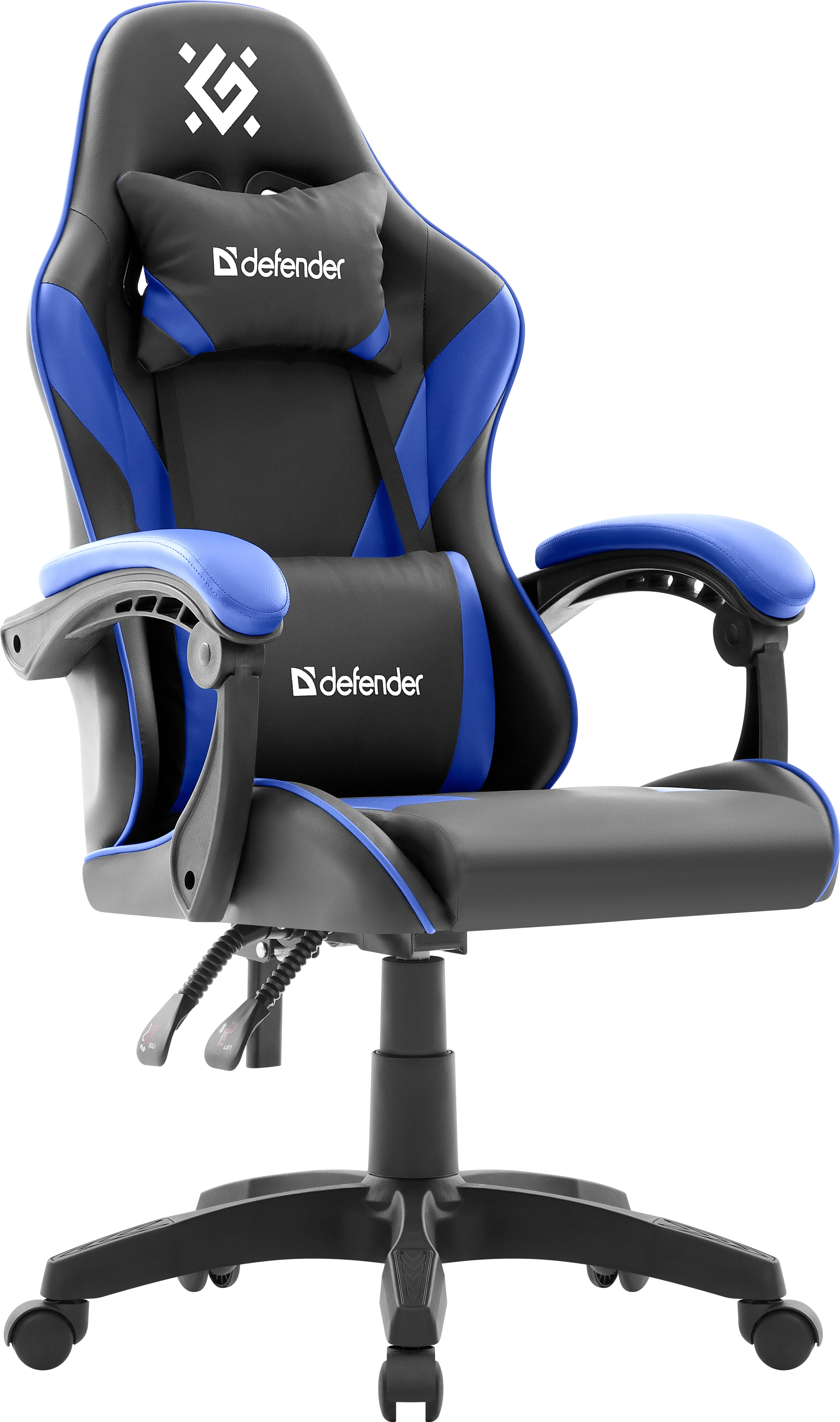 Стильное игровое кресло с мягкими подлокотниками и регулируемым наклоном спинки. В комплект входят шейная и поясничная подушки. Обивка выполнена из прочной экокожи черного цвета с ярко синими вставками.