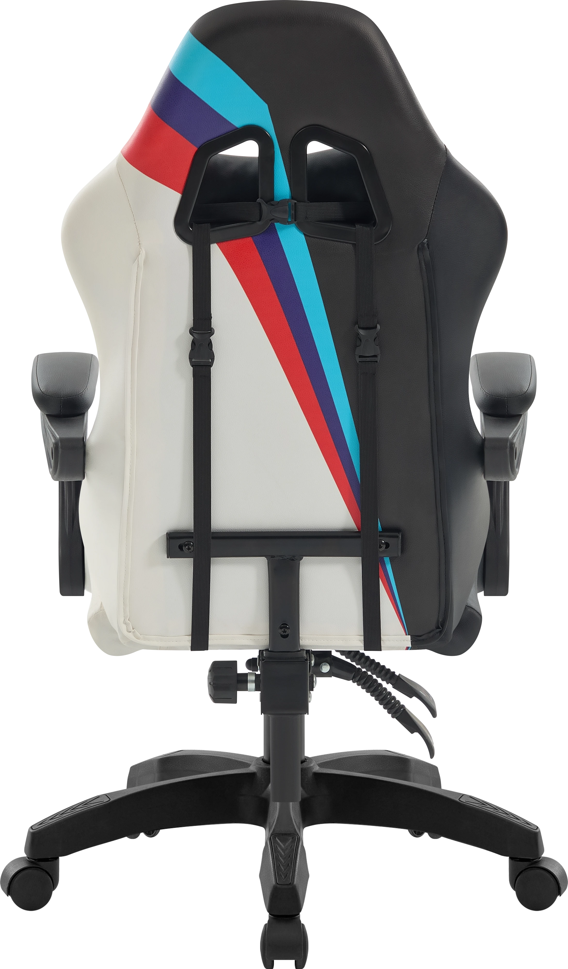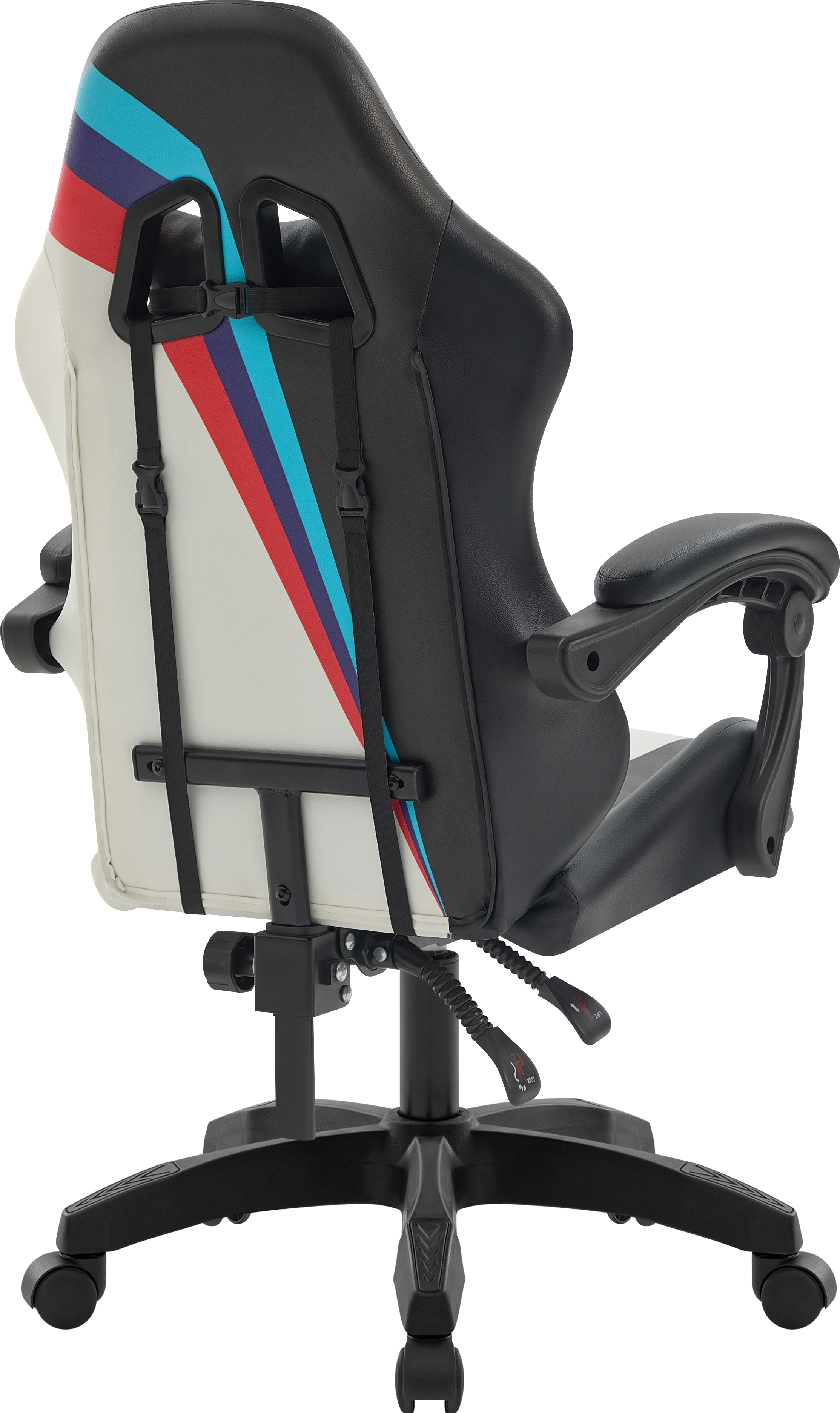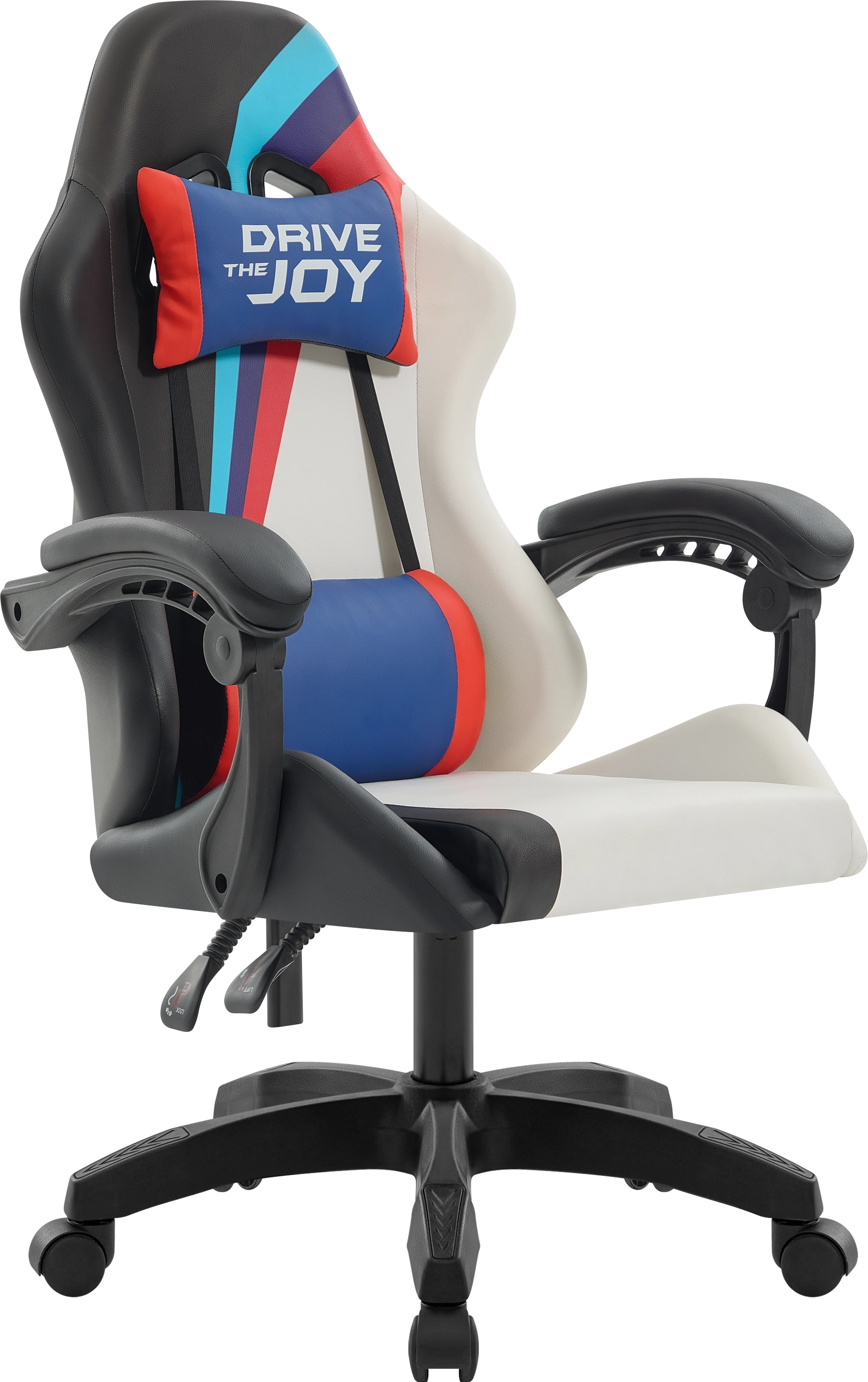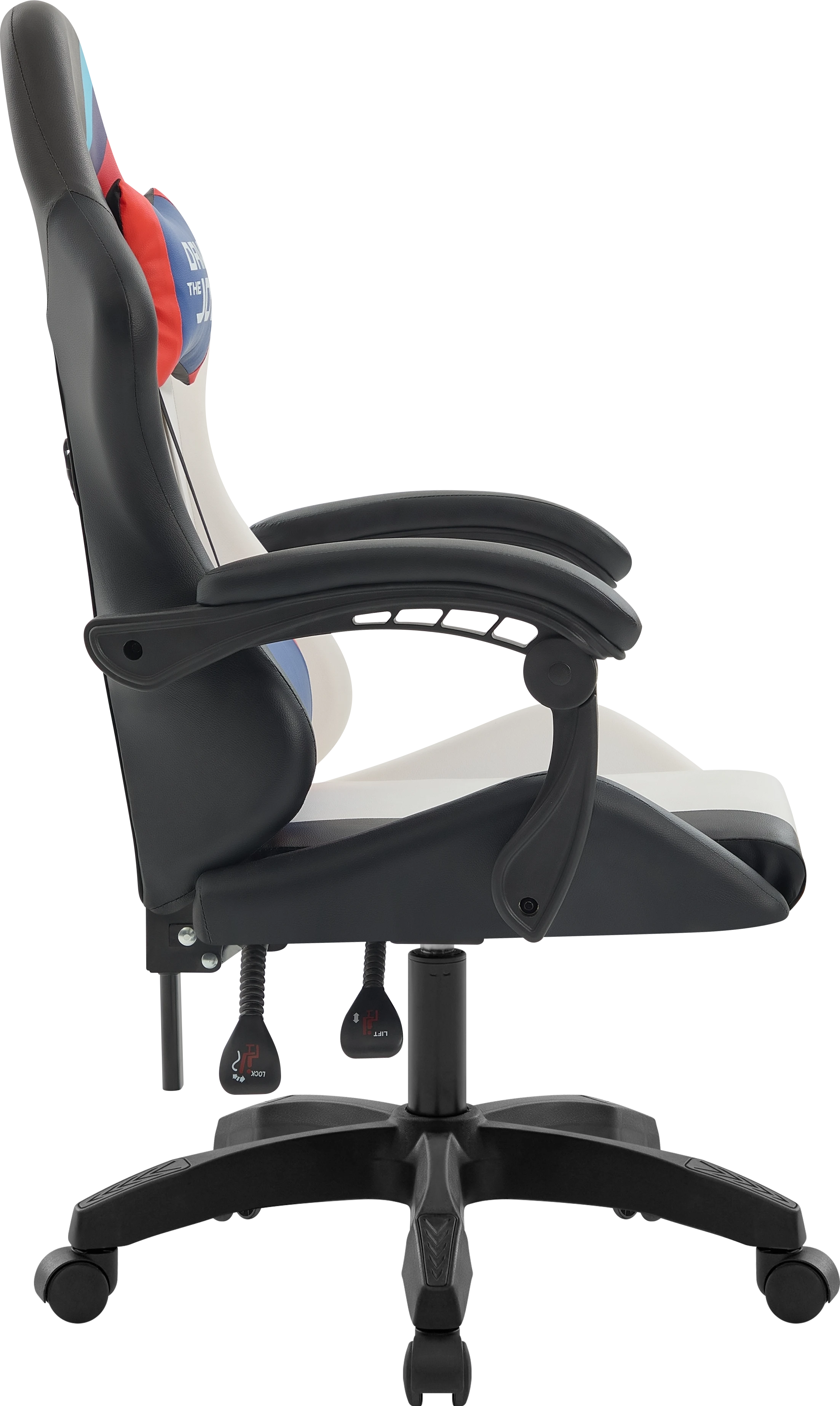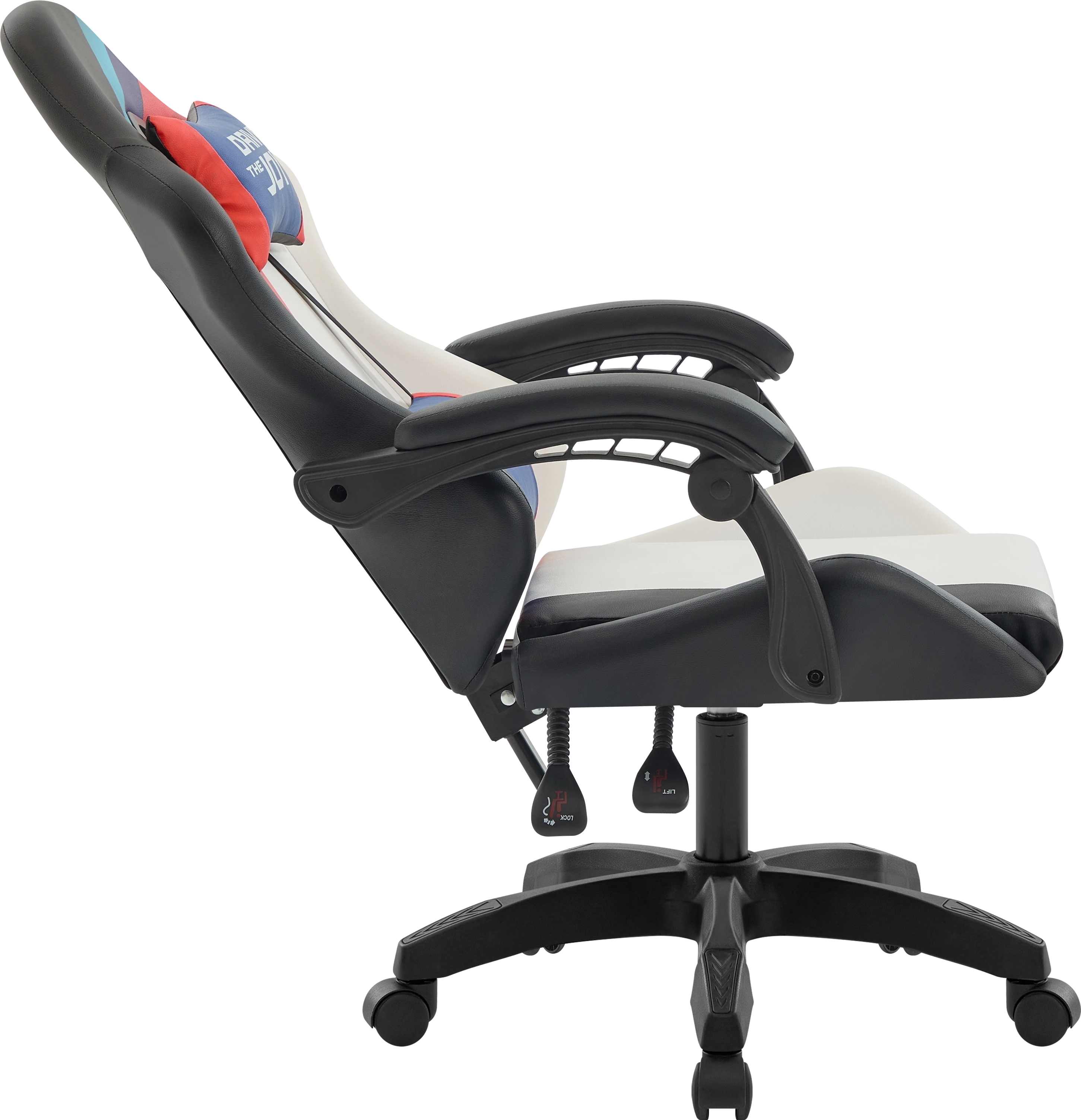Стильное игровое кресло с мягкими подлокотниками и регулируемым наклоном спинки. В комплект входят шейная и поясничная подушки. Обивка выполнена из прочной мягкой экокожи.