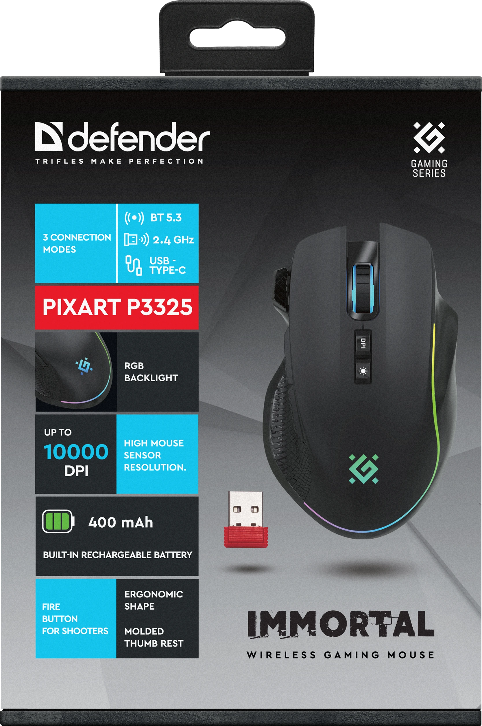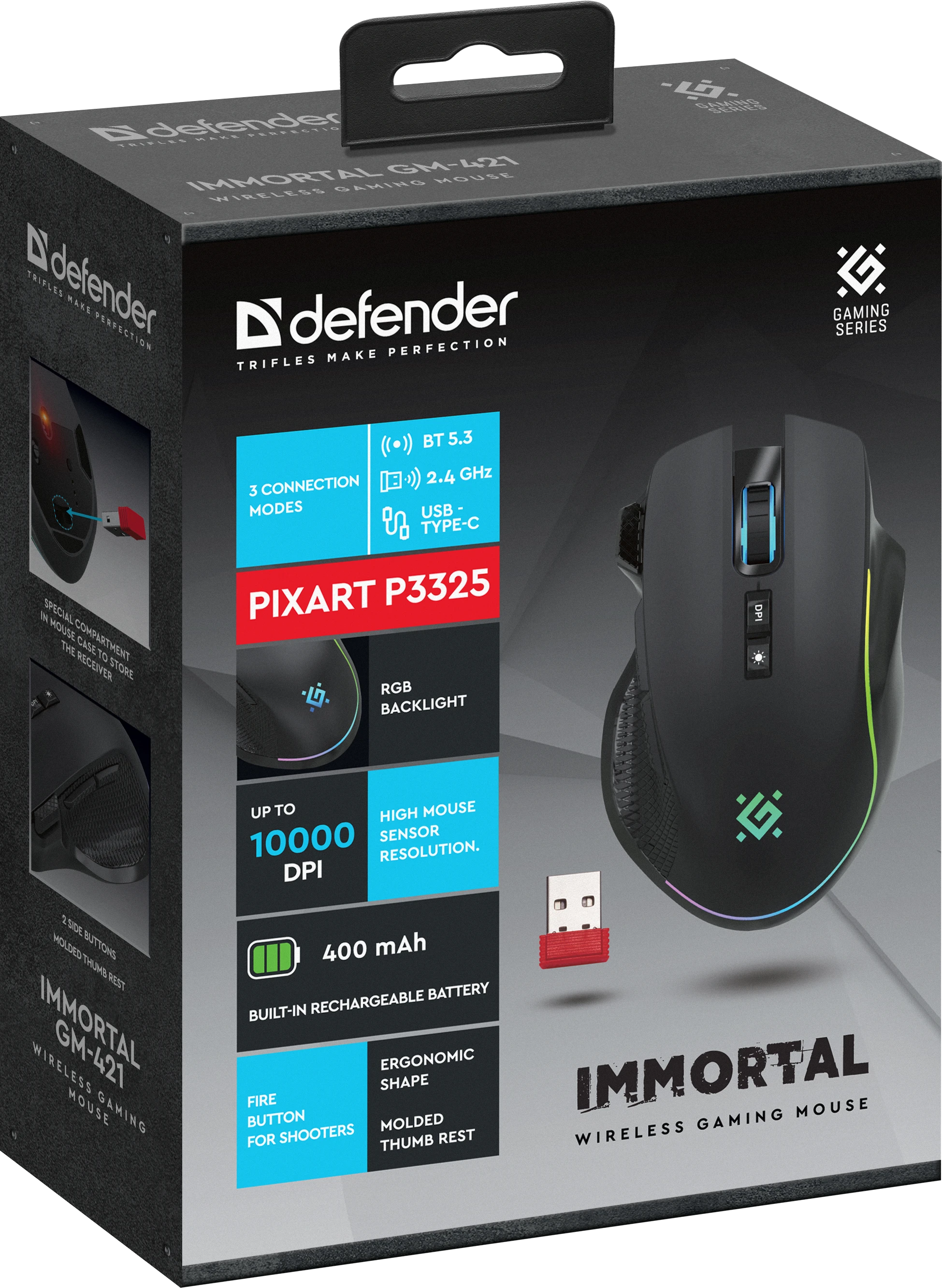 Эргономичная игровая мышь с изменяемой RGB подсветкой и кнопкой Fire для шутеров. В модели Immortal GM-421 предусмотрены 3 режима подключения: проводное, беспроводное по радиоканалу 2.4 Ггц, беспроводное подключение по Bluetooth. Также мышь имеет две боковые кнопки, тефлоновые ножки, а частота опроса в данной модели регулируется с помощью ПО.