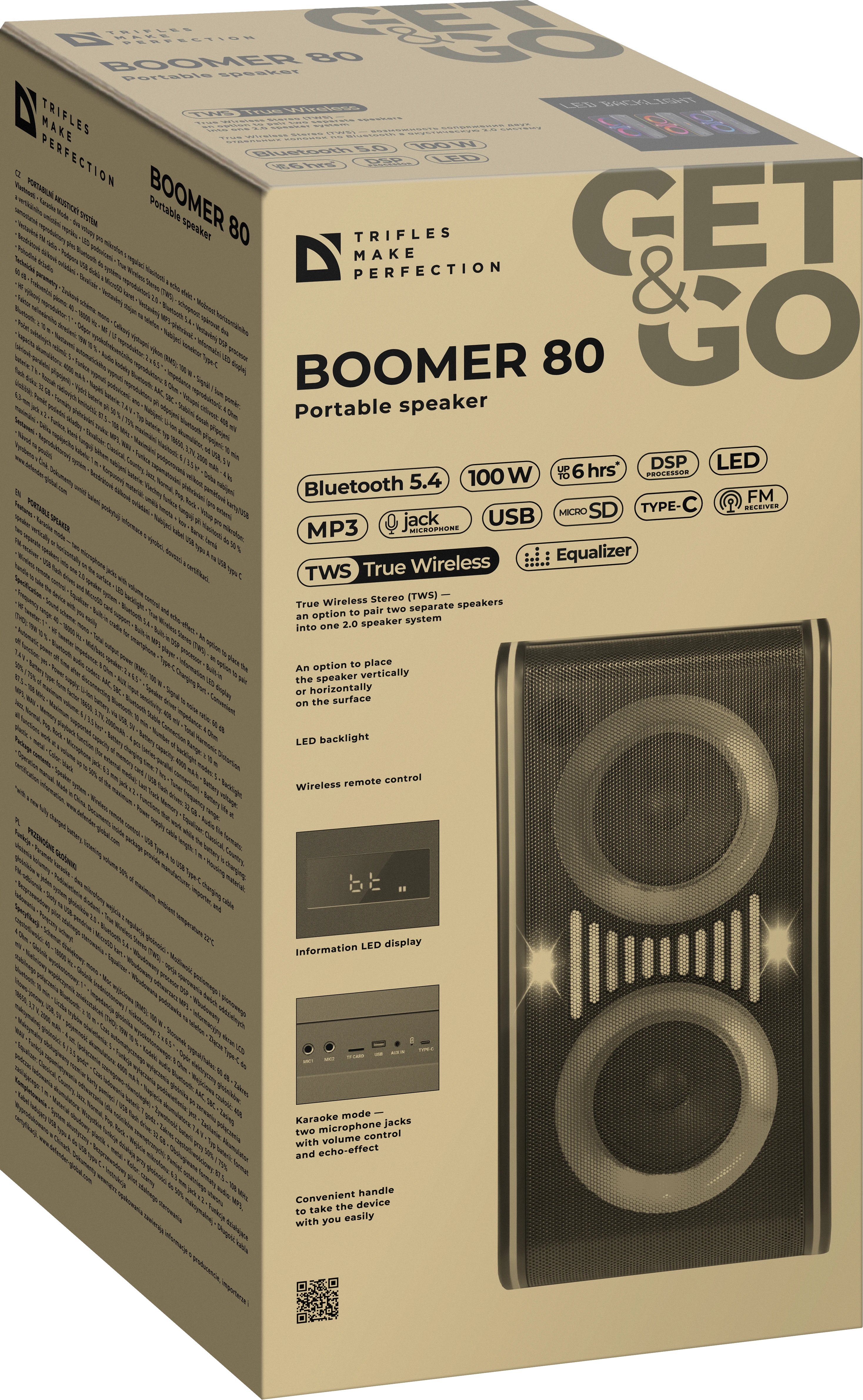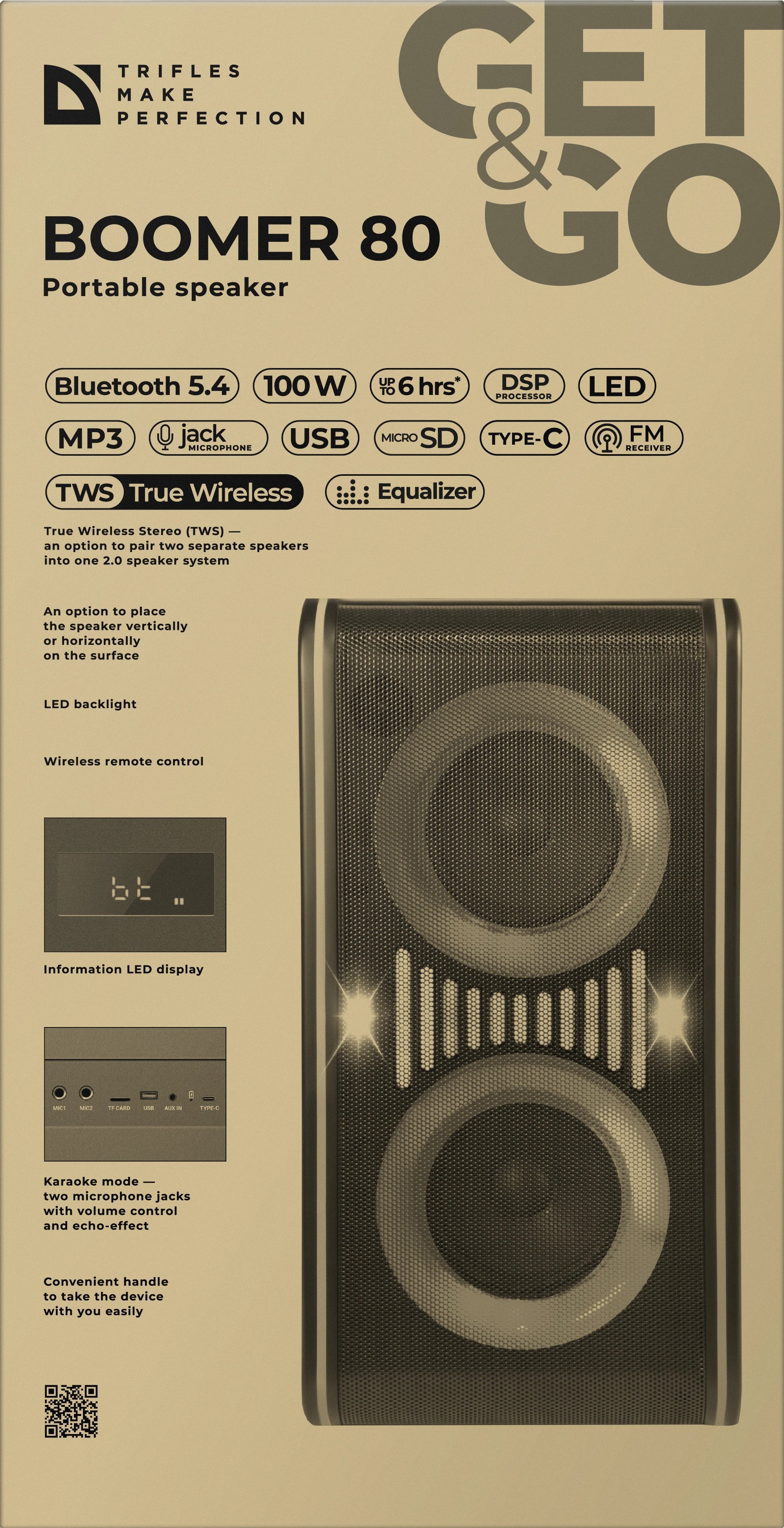 Эта активная акустическая система создана для максимальной гибкости в использовании. Благодаря возможности вертикальной и горизонтальной установки, вы сможете разместить колонку в любом месте, где нужен громкий и качественный звук. Мощность 100 Вт и два низкочастотных динамика (2x6.5") обеспечивают плотное звучание, способное озвучить как комнатную вечеринку, так и встречу на свежем воздухе. Ключевые особенности: Караоке-система "все в одном": Два входа для микрофонов (6.3 мм) с независимой регулировкой громкости и эффектом эха превращают колонку в полноценный центр караоке. Пойте дуэтом или устройте вокальный батл с друзьями. Универсальная установка: Уникальная конструкция позволяет ставить колонку как вертикально, так и горизонтально, адаптируя звуковое поле под планировку помещения без потери качества. Цифровая обработка звука: Встроенный DSP-процессор и предустановки эквалайзера (Pop, Rock, Classic, Jazz и др.) позволяют точно настроить звучание под любой жанр музыки. Актуальные технологии подключения: Современный Bluetooth 5.4 обеспечивает стабильное соединение и высокое качество аудиопотока (кодеки AAC, SBC). Функция TWS позволяет объединить две колонки в мощную стереопару. Световое шоу: Встроенная светодиодная подсветка с 5 режимами работы синхронизируется с музыкой, создавая праздничную атмосферу без дополнительного оборудования. Информативный LED-дисплей: Удобный экран отображает текущий режим работы, заряд батареи и настройки, обеспечивая полный контроль над воспроизведением. Мультимедийность и автономность: Встроенный MP3-плеер, FM-радио, поддержка USB и MicroSD карт (до 32 ГБ) делают колонку независимой от смартфона. Современный разъем Type-C упрощает зарядку встроенного аккумулятора 4000 мАч, которого хватает до 6 часов работы. Удобная ручка и продуманный вес (5.4 кг) позволяют легко брать ее с собой.