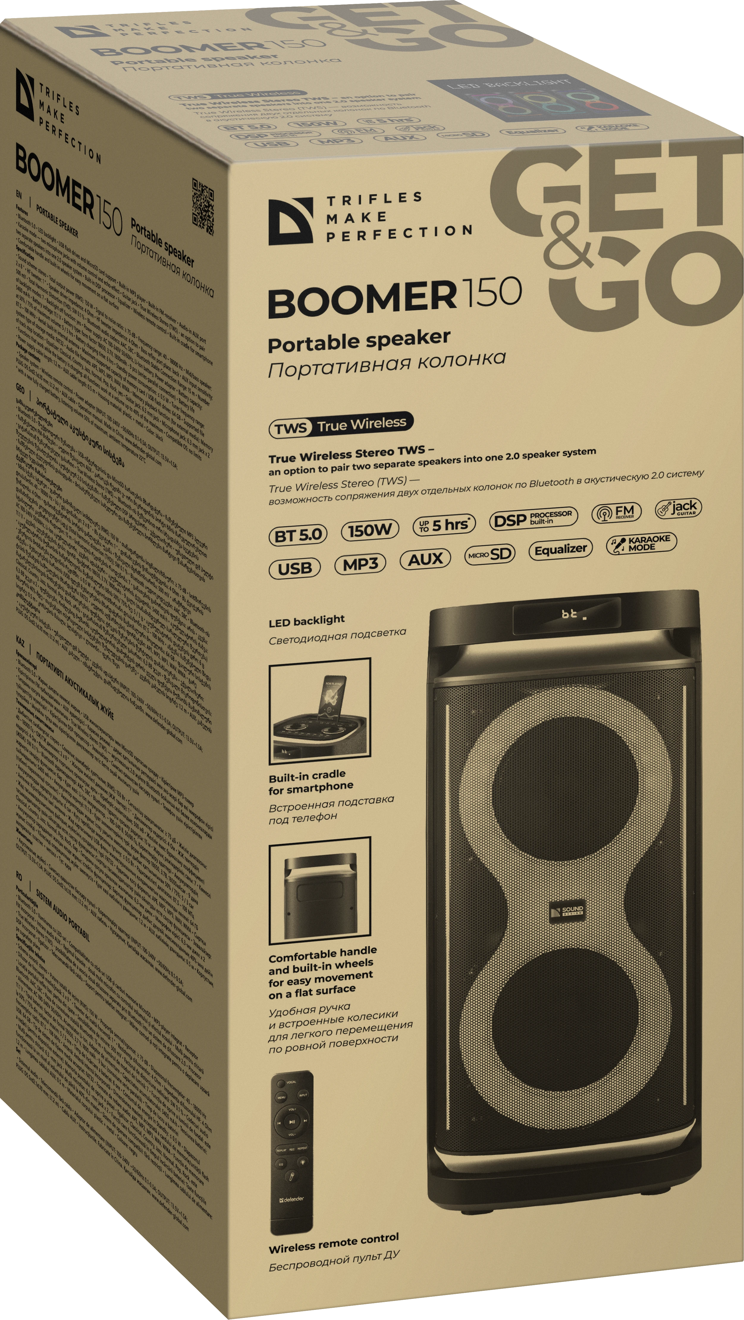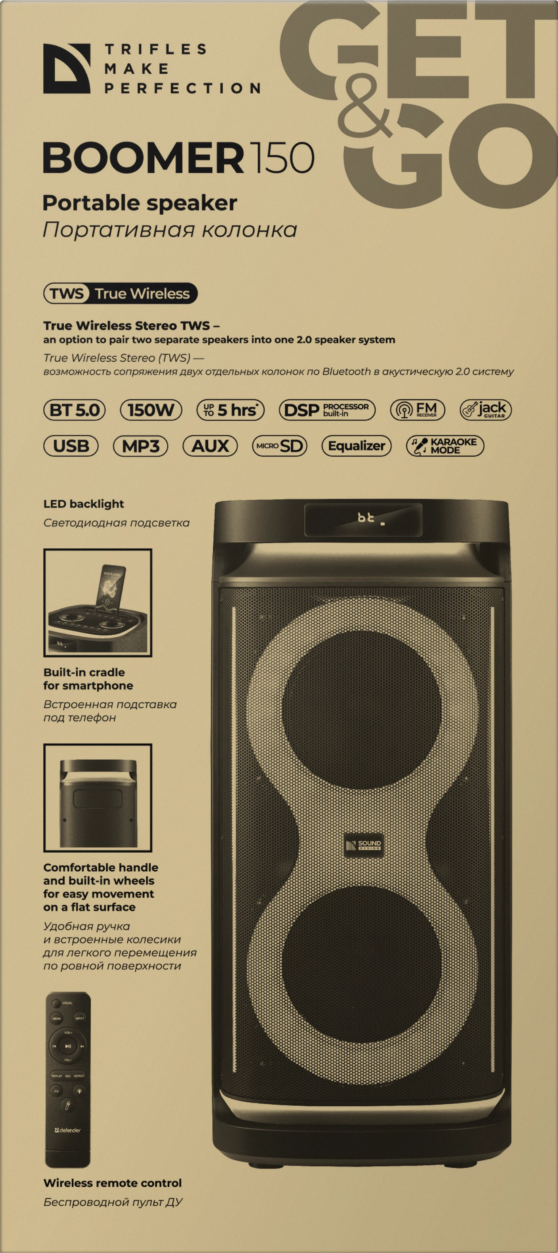 Колонка представляет собой активную стереосистему фазоинверторного типа, оснащенную двумя мощными НЧ/СЧ-динамиками (8") и ВЧ-твитером (1"). Суммарная выходная мощность 150 Вт обеспечивает уверенное озвучивание больших помещений и открытых пространств. Ключевые особенности: Мультимедийность: Встроенный MP3-плеер, FM-тюнер (87.5—108 МГц) и поддержка носителей до 64 ГБ (FAT32). Студийное качество: Цифровой DSP-процессор и предустановки эквалайзера (Pop, Rock, Classic, Jazz и др.) позволяют тонко настроить звуковую сцену. Профессиональные возможности: Два микрофонных входа (6.3 мм) с независимой регулировкой громкости и реверберацией (эхо) + отдельный вход для гитары. Беспроводные технологии: Bluetooth 5.0 (AAC/SBC, радиус 15 м) с функцией TWS для создания стереопары. Автономность и питание: Встроенный аккумулятор 5400 мАч (Li-Ion 18650) обеспечивает до 5 часов работы на средней громкости. Эргономика: Продуманная конструкция с ручкой и колесиками для транспортировки. Управление с корпуса или с пульта ДУ. Технические характеристики: Мощность: 150 Вт | Частотный диапазон: 40-18000 Гц | Вес: 11.4 кг | Габариты: 71.5x32x33 см.