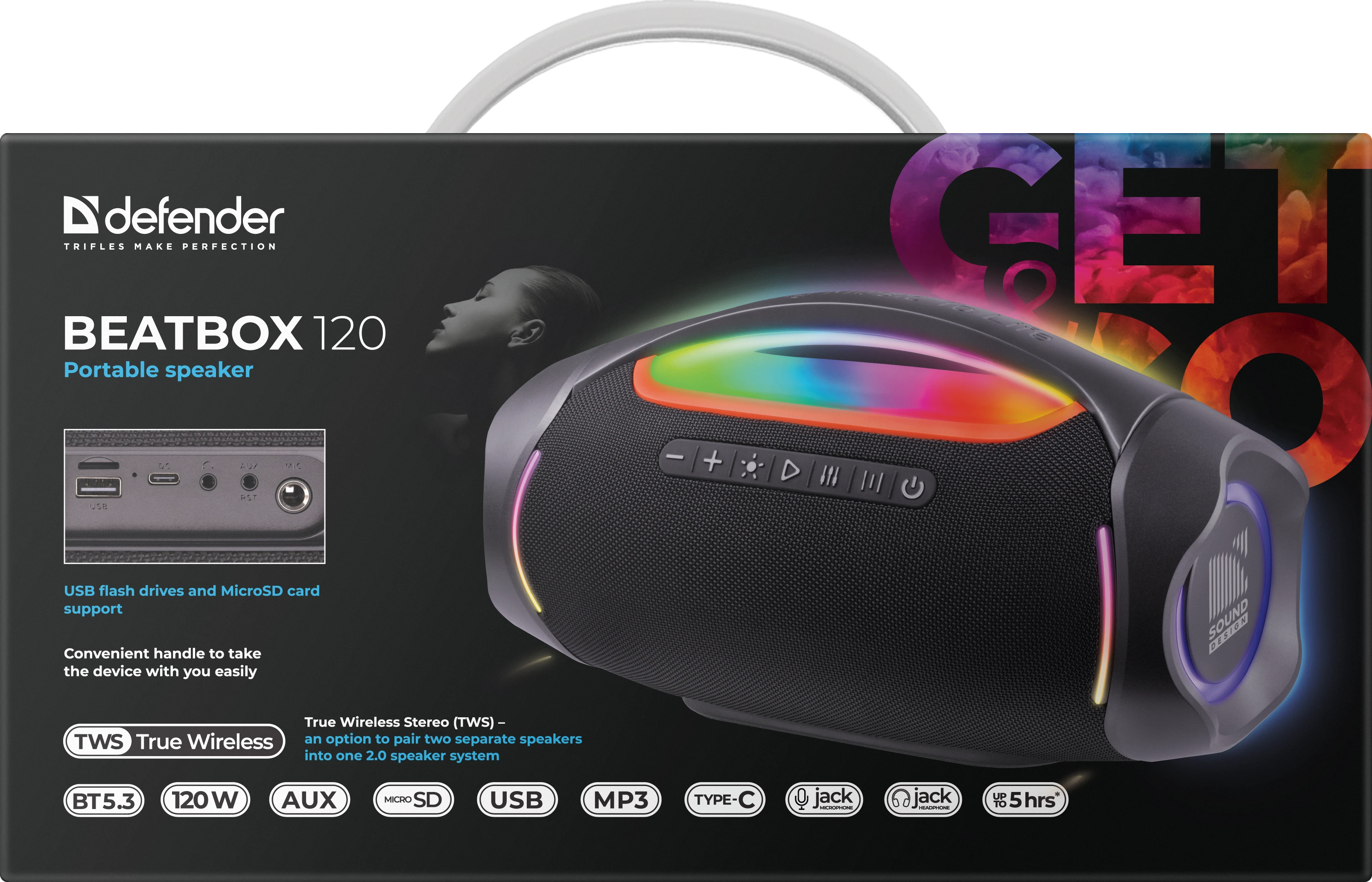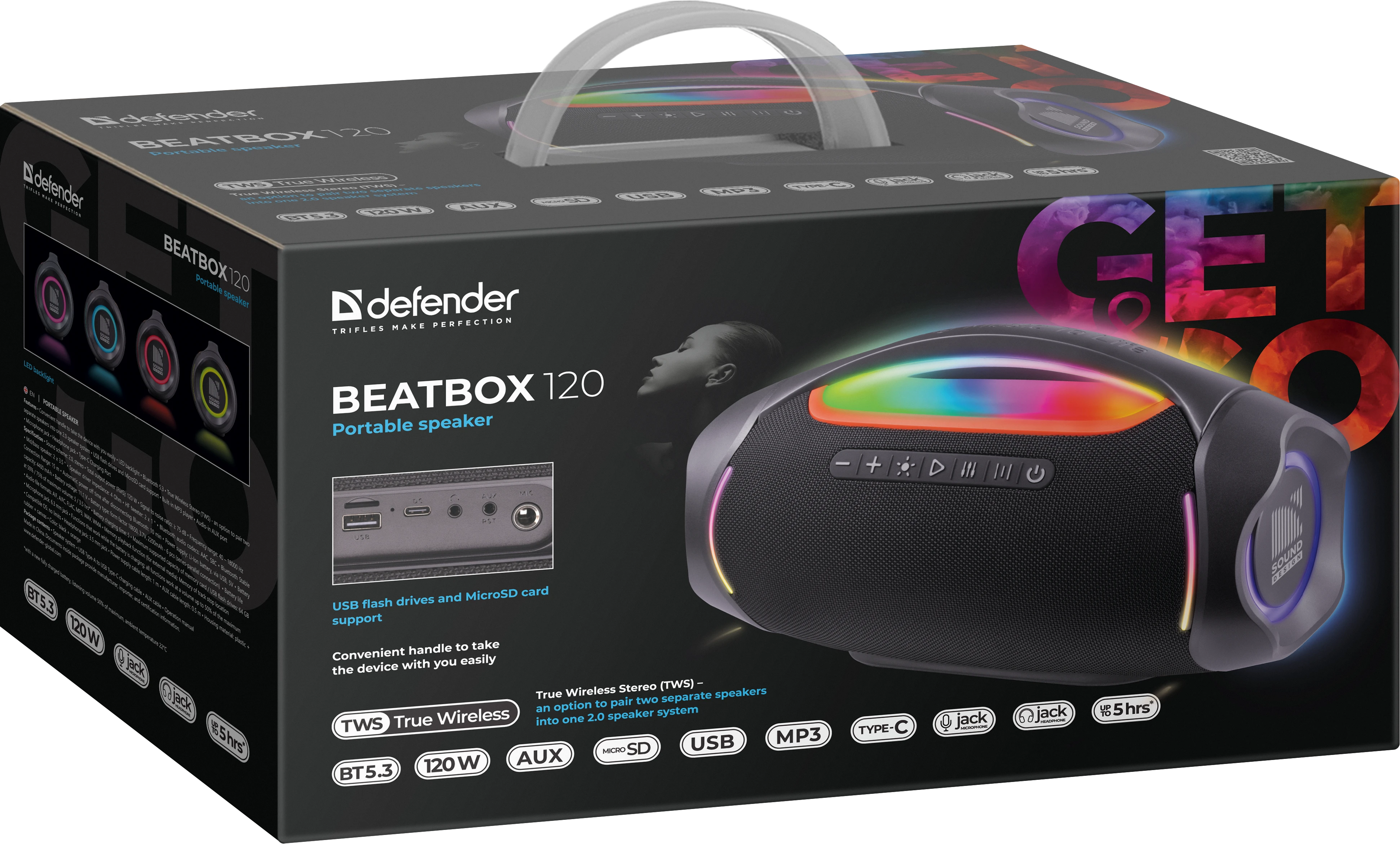 Beatbox 120 — портативная акустическая система с мощным звуком и светодиодной подсветкой. Объединяя в себе форму классического бумбокса и современные технологии, колонка обеспечивает чистый стереозвук мощностью 120 Вт. Фирменная RGB-подсветка с несколькими режимами охватывает ручку, излучатели и корпус, создавая уникальную атмосферу. Ключевые возможности: Мощный 120Вт звук с глубокими басами и чёткой детализацией. Технология TWS для синхронизации двух колонок в стереосистему 2.0. Универсальные источники звука: Bluetooth 5.3, USB-флешки, MicroSD-карты (встроенный MP3-плеер), AUX-вход. Практичная эргономика: удобная ручка для переноски и разъём Type-C для зарядки. До 5 часов автономной работы на средней громкости. Идеальное решение для выездов на природу, вечеринок и любых ситуаций, где нужен громкий, насыщенный звук и яркое визуальное сопровождение.