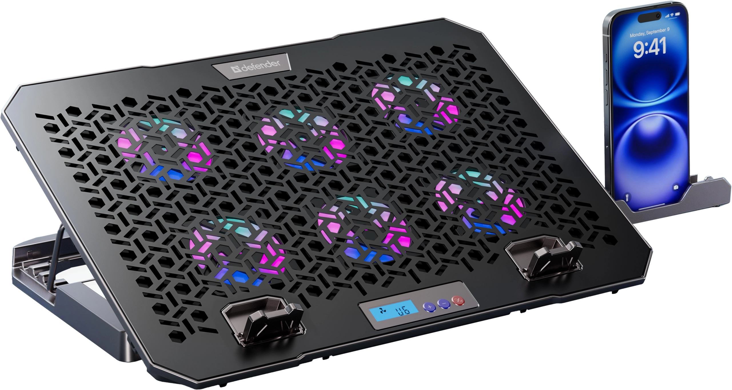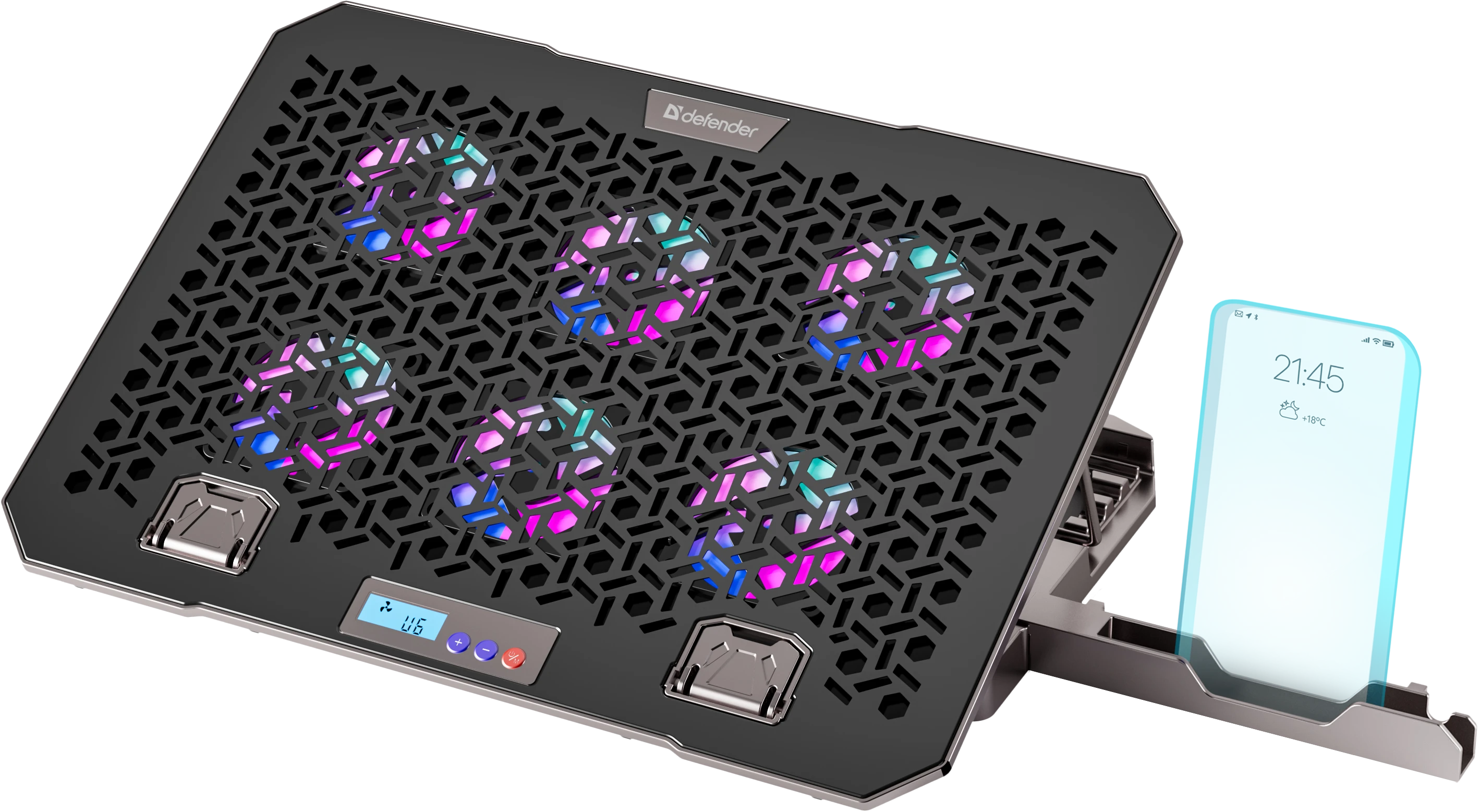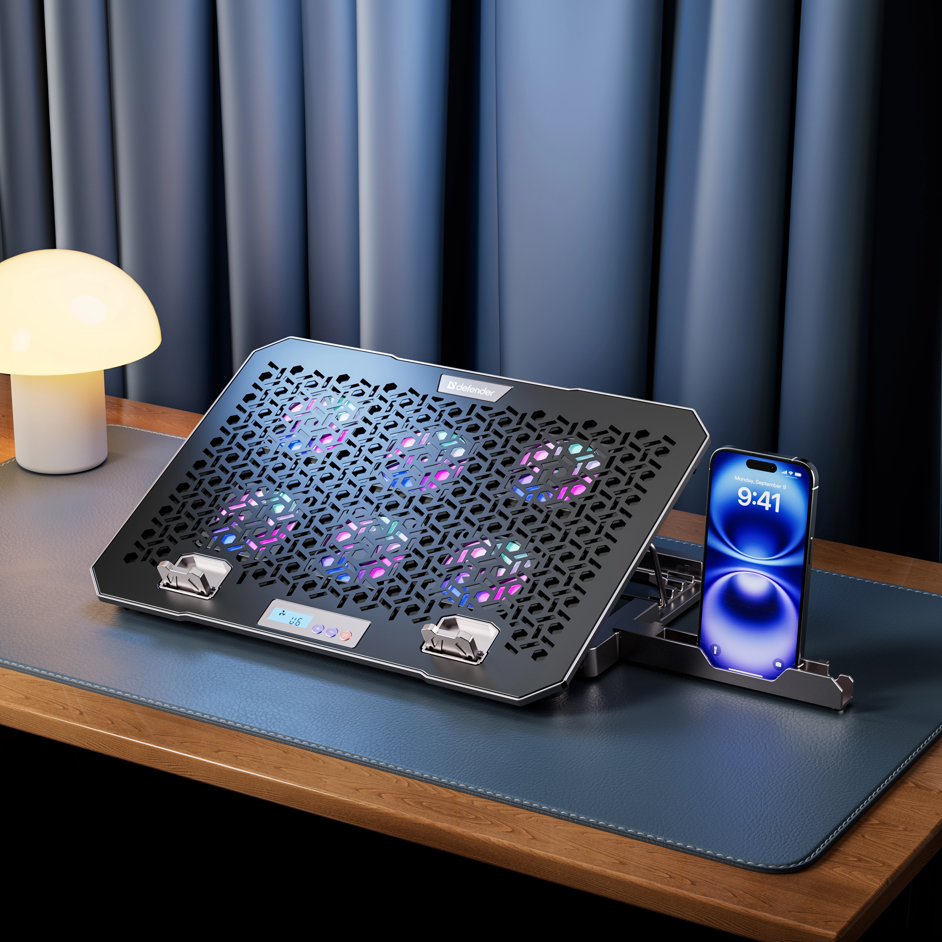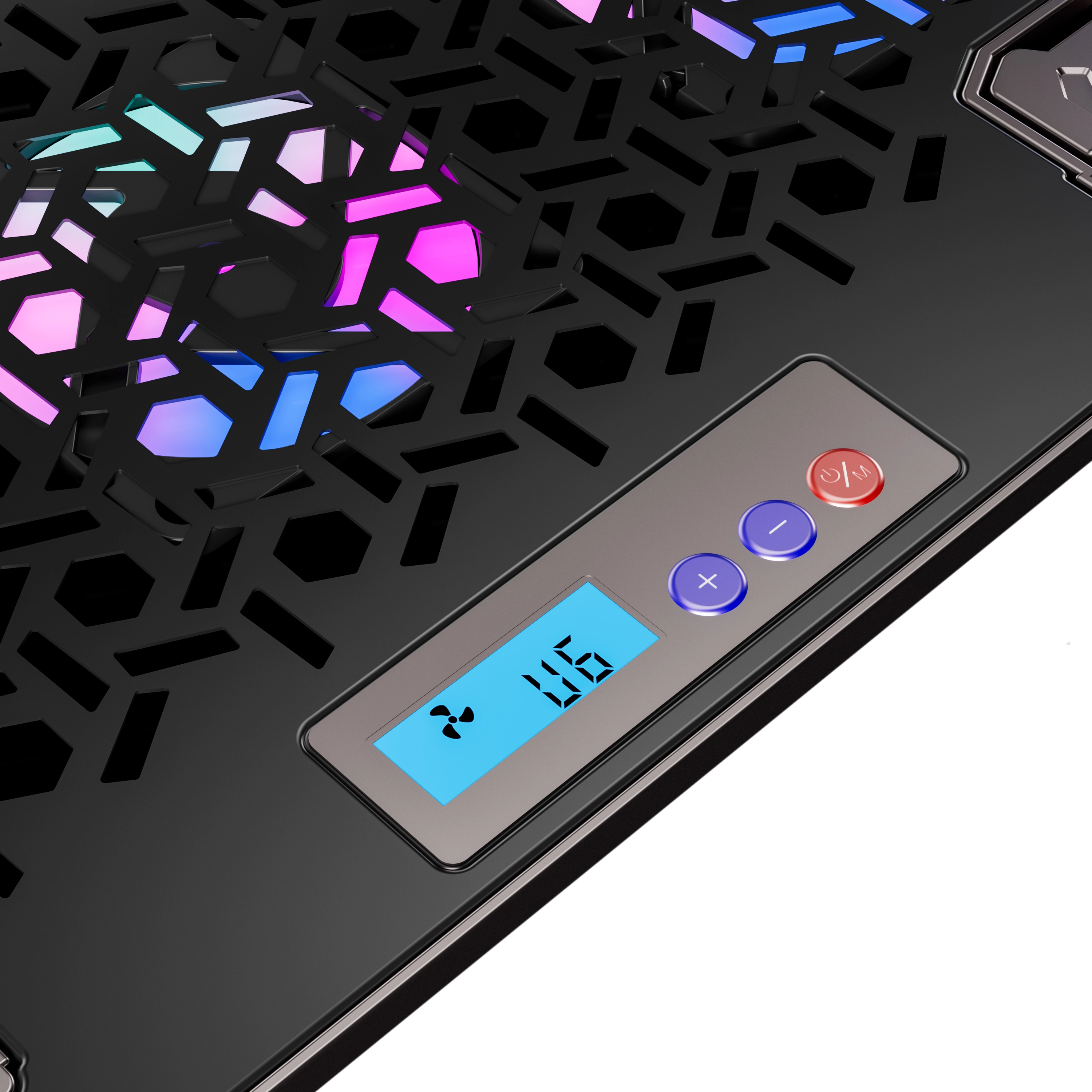 Подставка для ноутбука с шестью мощными вентиляторами, которые создают активный воздушный поток, предотвращая перегрев и обеспечивая комфортную работу. Яркость и цвет RGB подсветки регулируется кнопкой на корпусе, создавая атмосферу, идеально подходящую для работы или отдыха.