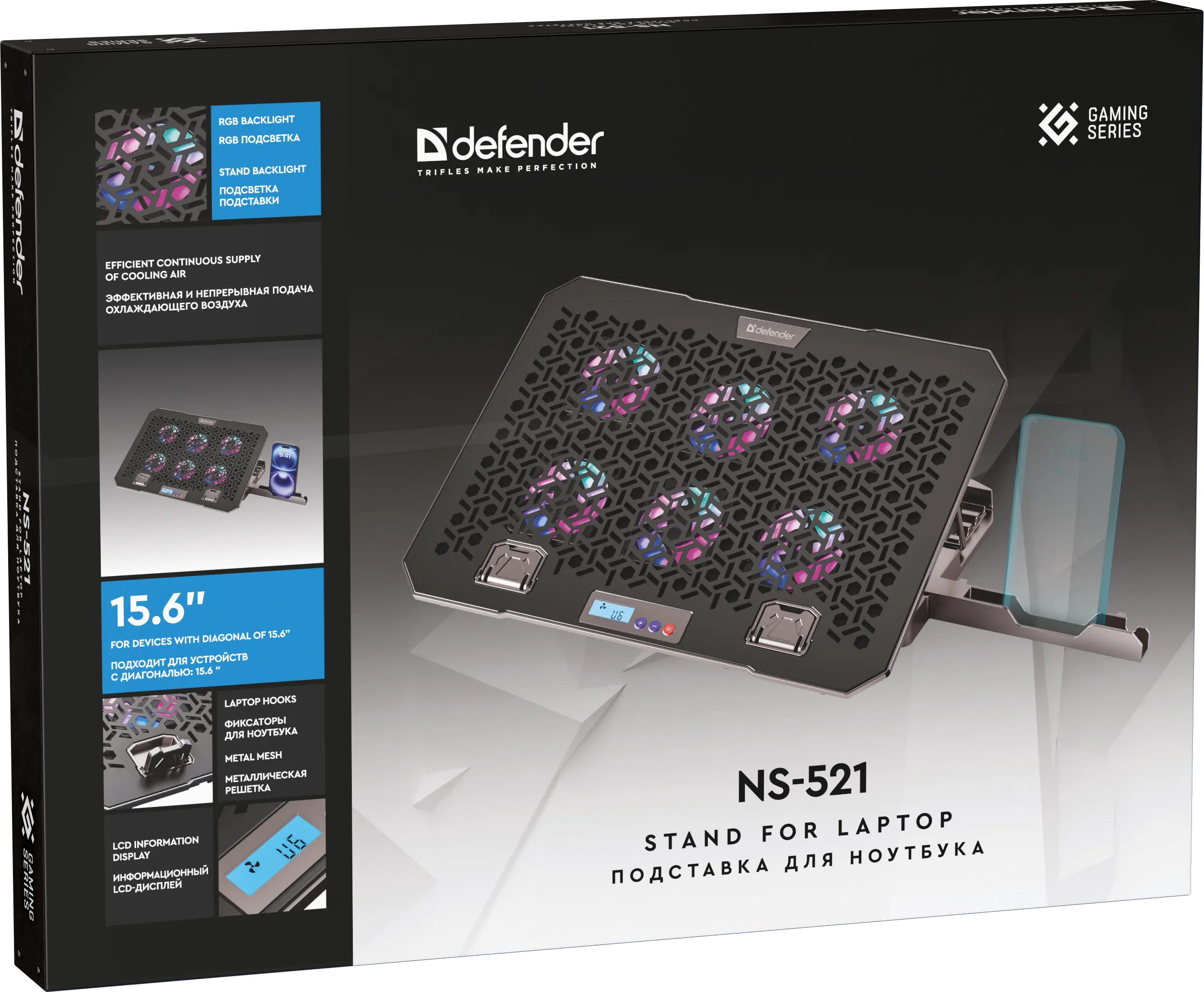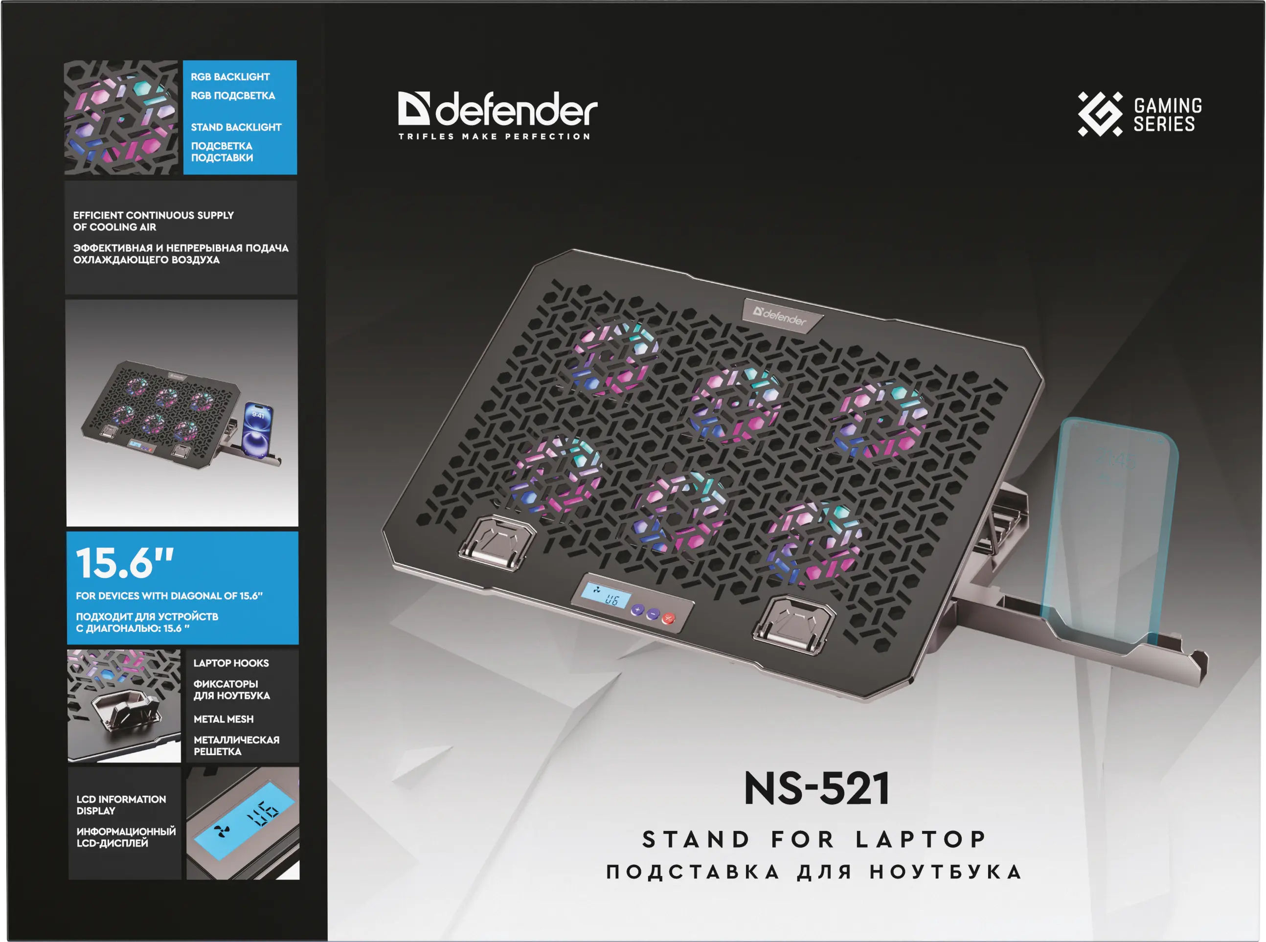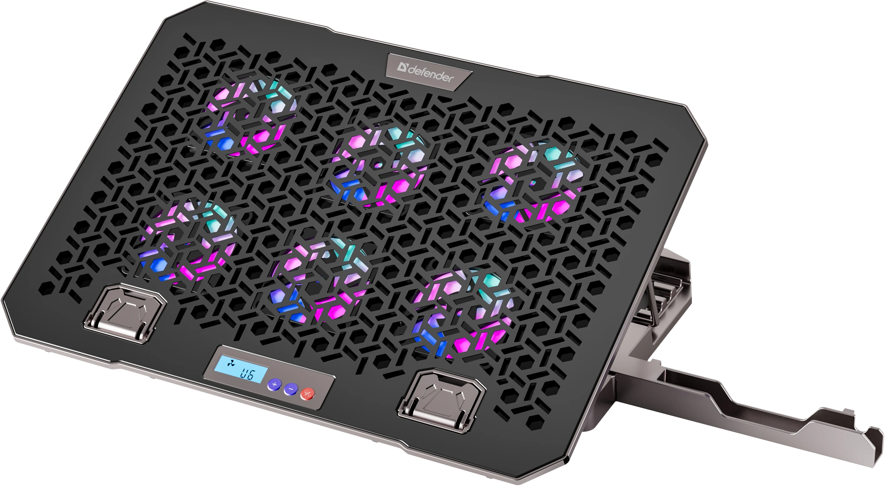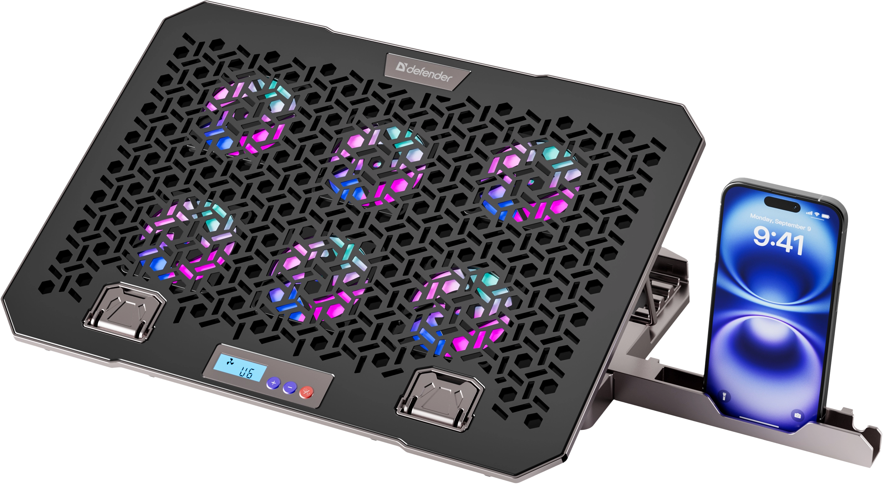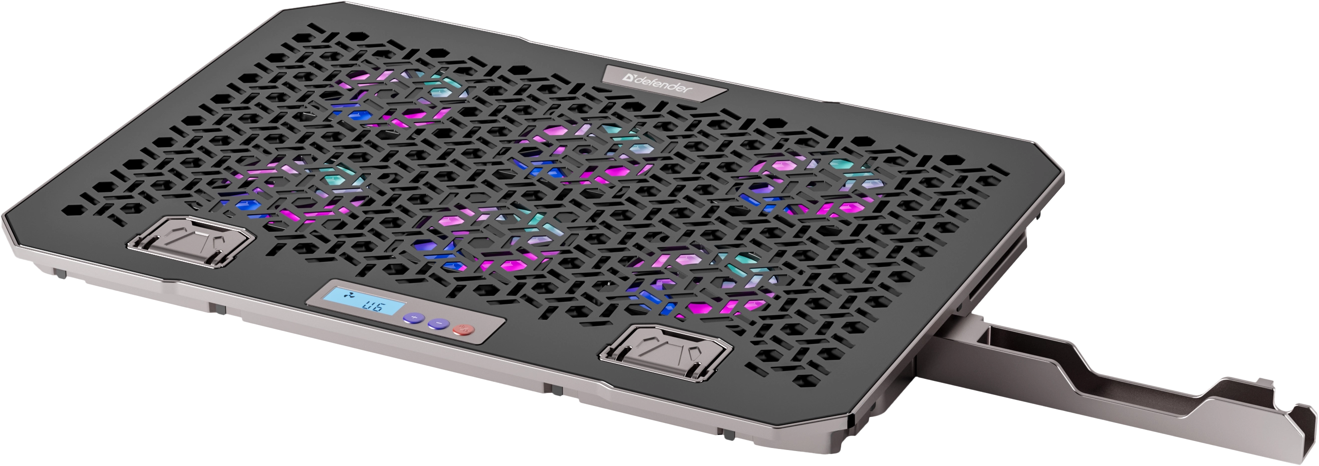 Подставка для ноутбука с шестью мощными вентиляторами, которые создают активный воздушный поток, предотвращая перегрев и обеспечивая комфортную работу. Яркость и цвет RGB подсветки регулируется кнопкой на корпусе, создавая атмосферу, идеально подходящую для работы или отдыха.